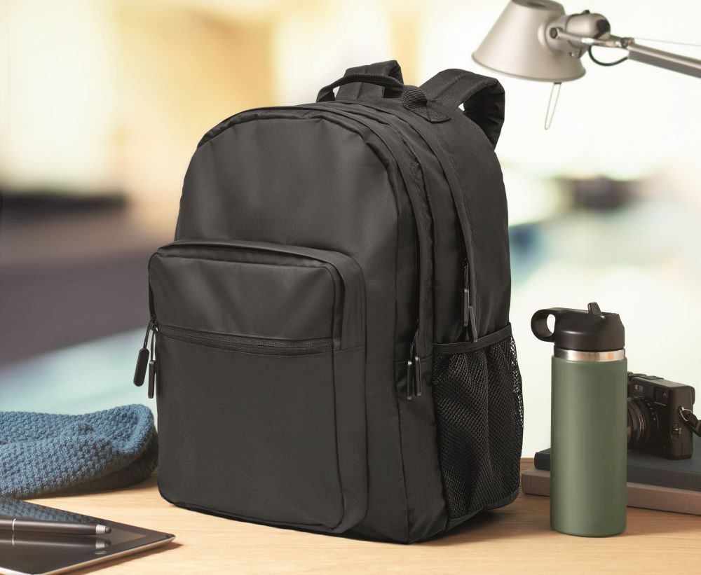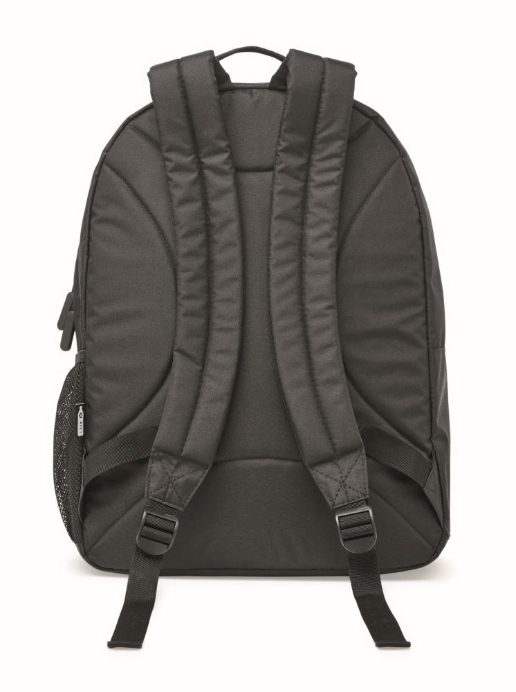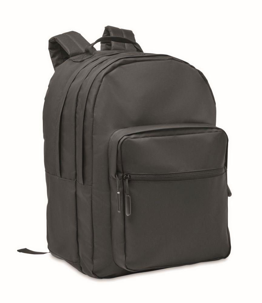 15 inch laptop backpack in 300D RPET polyester. It has 2 large zippered compartments, double zippered front pockets and mesh side pocket. Padded back, bottom and shoulder straps.