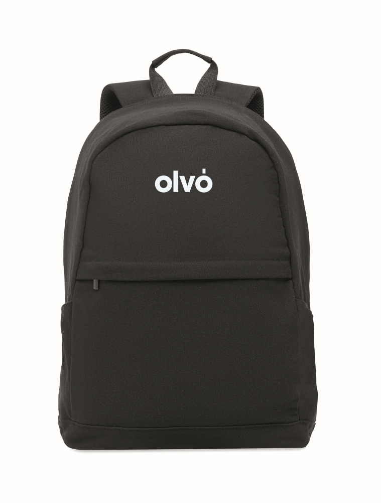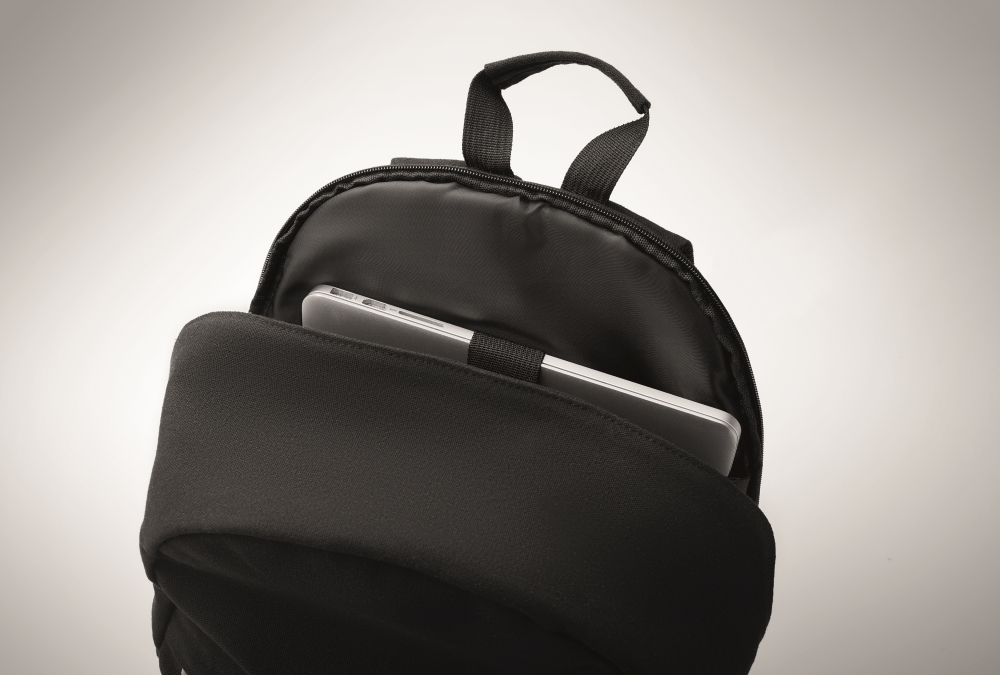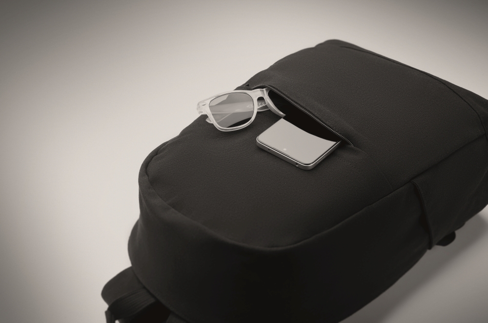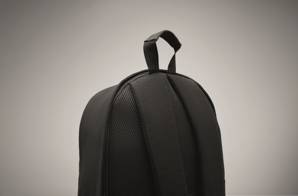 15 inch laptop backpack in recycled pre-consumer cotton and recycled polyester (70%/30%). It has front zippered pocket, zippered pocket on the back side. Soft padded back and shoulder straps. Trolley holder on reverse side. Dimensions: 34 x 45 x 13 cm
