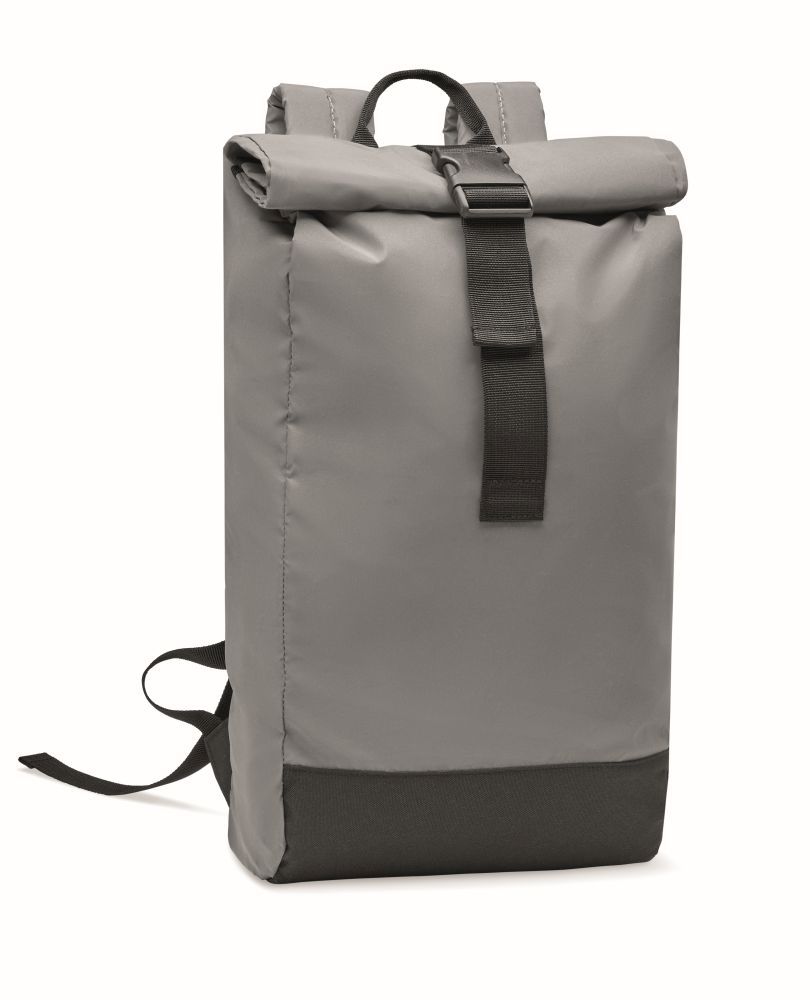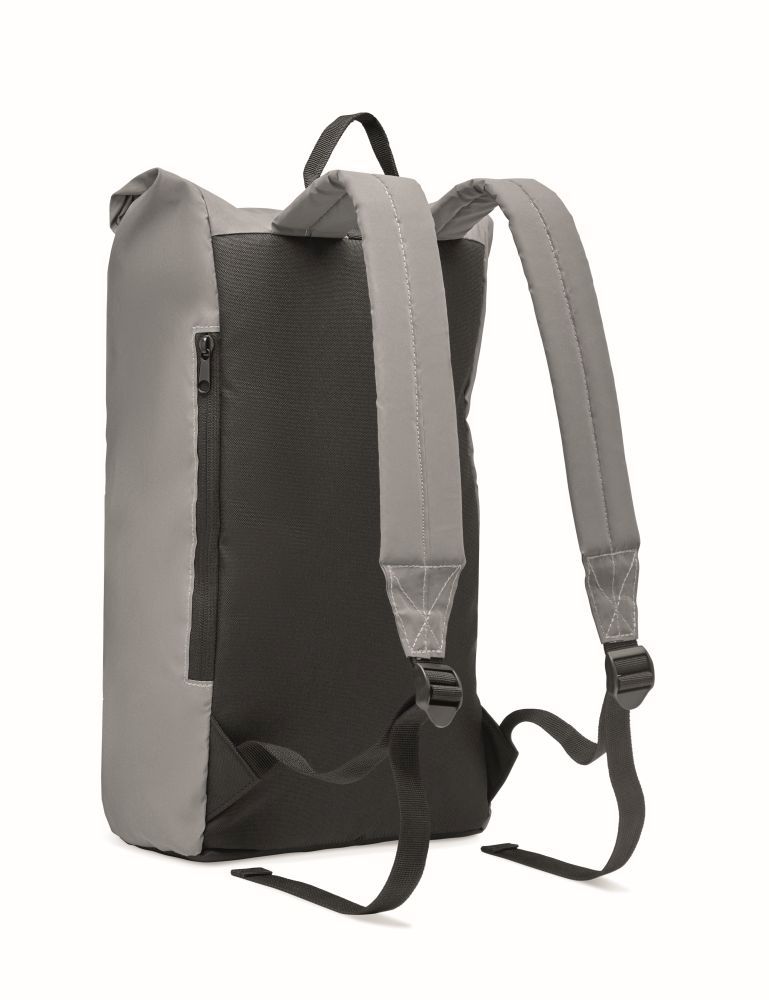 15 inch laptop rolltop backpack in high reflective 190T polyester. Additional internal side with hook and loop closure. Padded back, straps and bottom. Front sided zippered pocket. Bottom part in 600D recycled polyester.