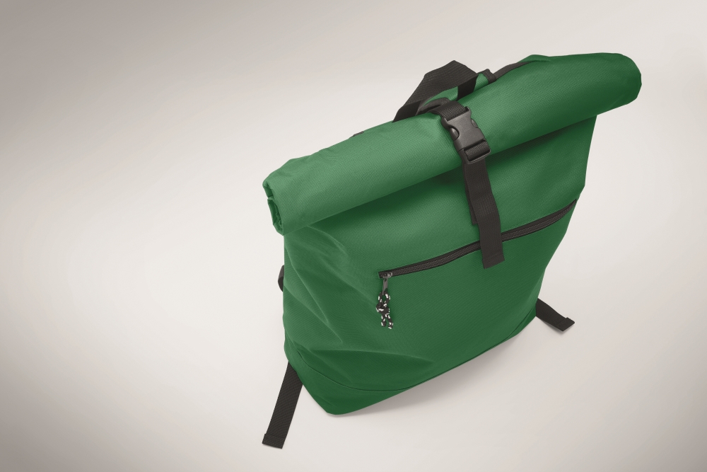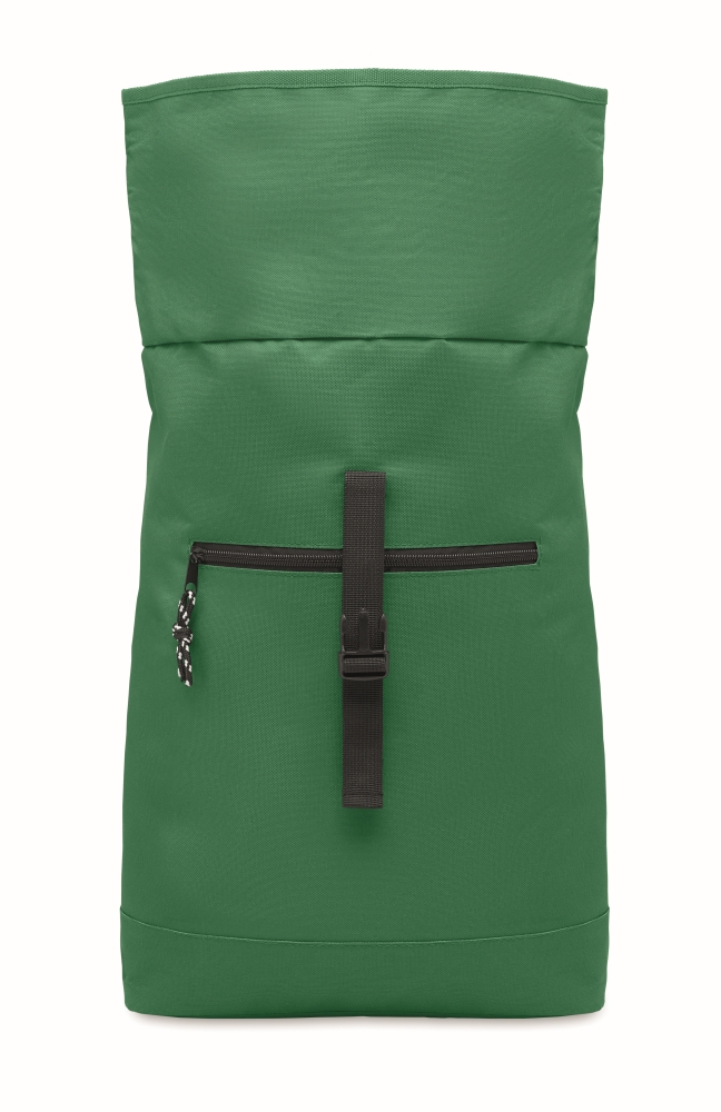 15 inch rolltop laptop backpack in 600D polyester with padded back and base reinforcement. Zippered front pocket. 210D lining. Dimensions: 34 x 13 x 61 cm