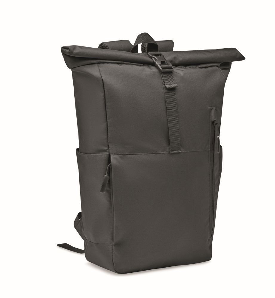 15 inch rolltop laptop backpack in 300D RPET polyester. Large zippered front pocket, hidden side pocket with small carabineer loop inside. The carabiner is not for climbing (non professional use).