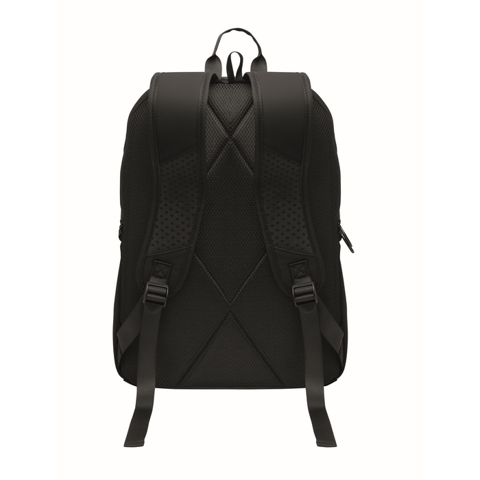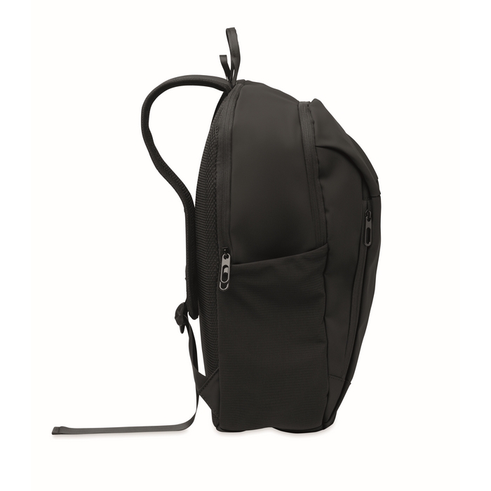 15 inch laptop backpack in soft PU with padded back and hidden zippered main compartment. 1 zippered front pocket, 2 front side zippered pockets and 2 elastic mesh side pockets. With 210D RPET lining.Dimensions: 43,5 x 15 x 30cm