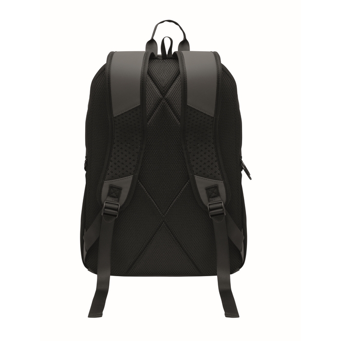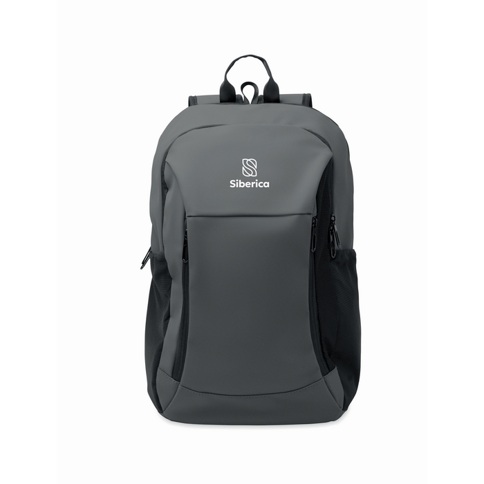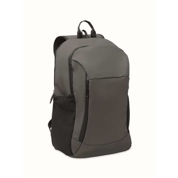 15 inch laptop backpack in soft PU with padded back and hidden zippered main compartment. 1 zippered front pocket, 2 front side zippered pockets and 2 elastic mesh side pockets. With 210D RPET lining.Dimensions: 43,5 x 15 x 30cm