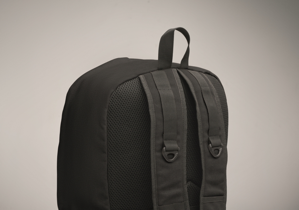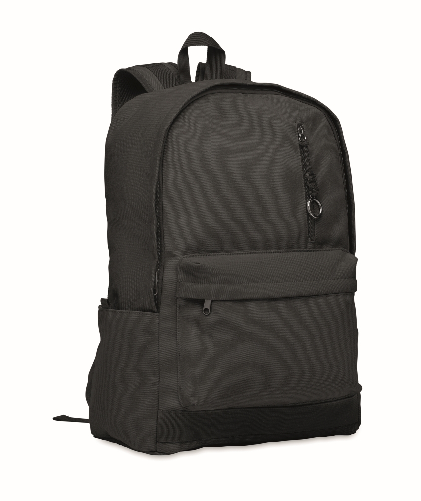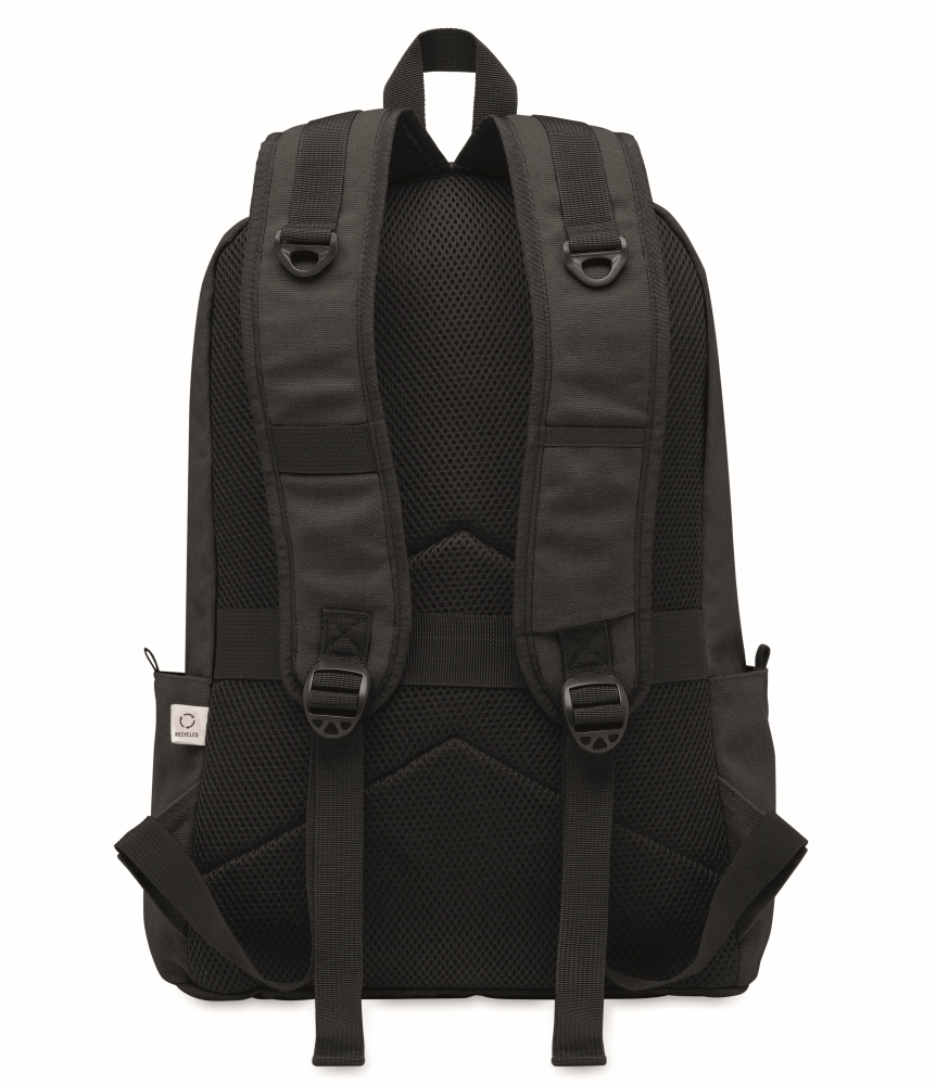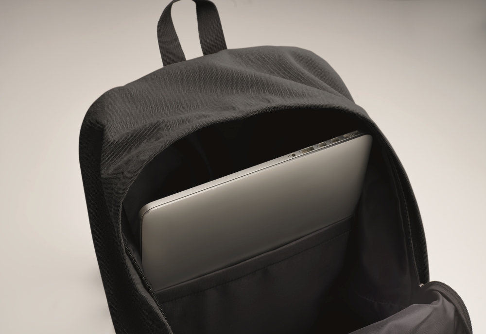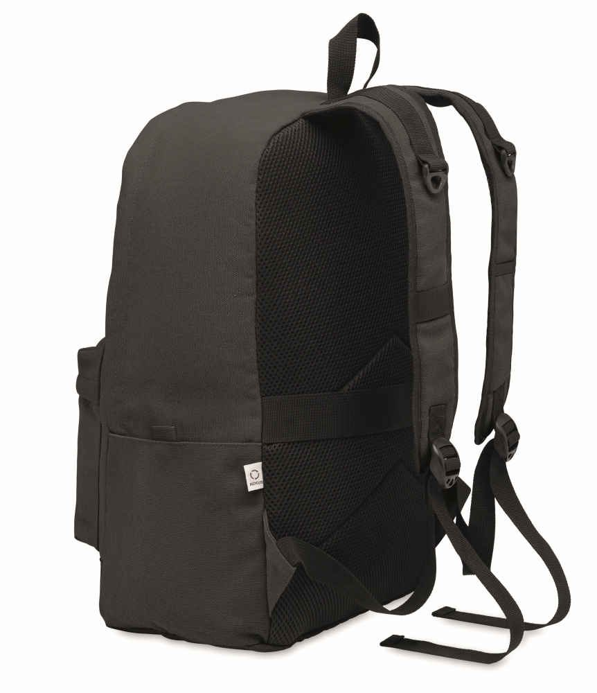15inch laptop backpack in recycled washed canvas. Large front zippered pocket with inner laptop compartment. Small front zippered pocket. Two side-slip pockets. Padded back and shoulder straps, back panel and base. 450 gr/m2. Dimensions: 30 x 18 x 45 cm