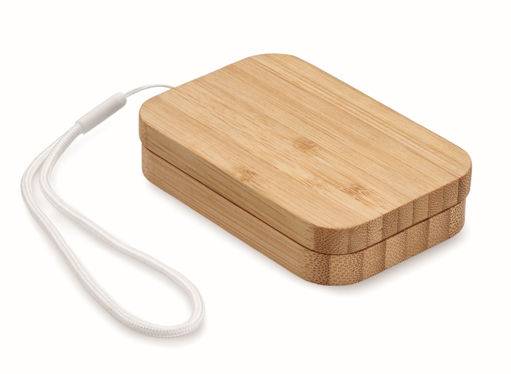 15W wireless charger with 3-in-1 charging cable with assorted connectors. Presented in bamboo magnetic closure box with strap. Type-C to Type C cable, C to USB-A, C to micro-B, C connectors. Dimensions: 9 x 6 x 1,9 cm