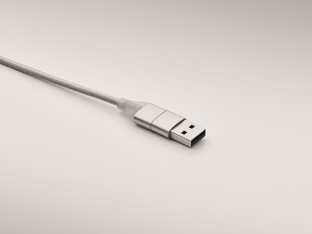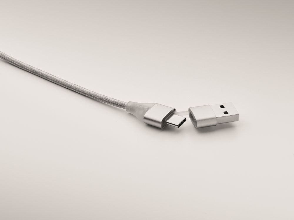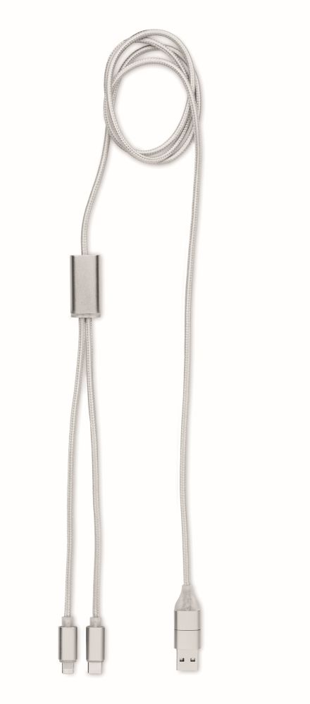 Charging cable in aluminium with input: 2-in-1 type-C & type-A and micro-B (2 in 1 pin), Type C and micro B output. Cable length: 120cm.