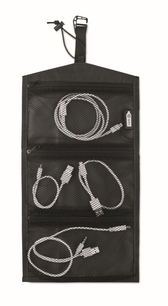 210D RPET cable roll bag organizer. It has a RPET mesh with 3 zippered compartments. This bag can also be used as a cosmetic bag.