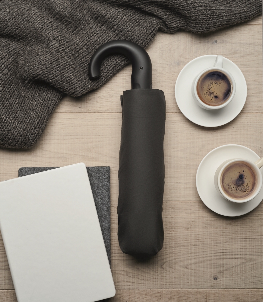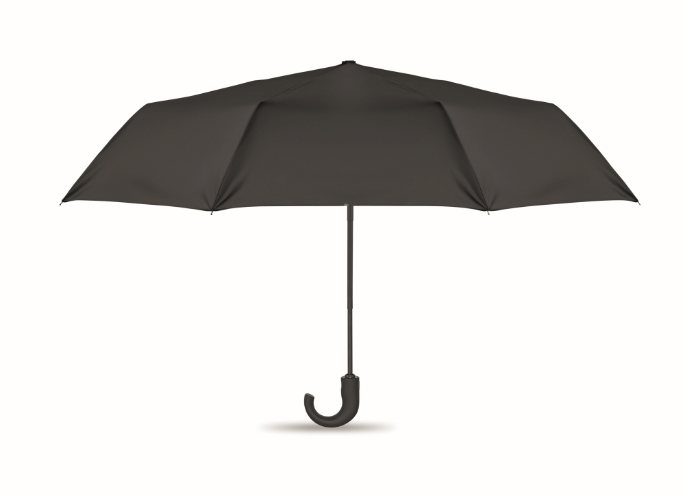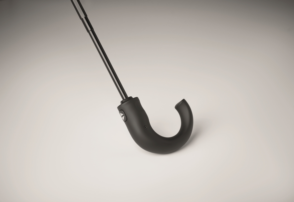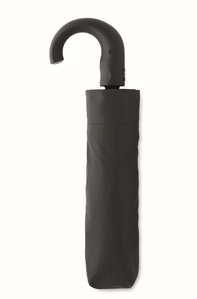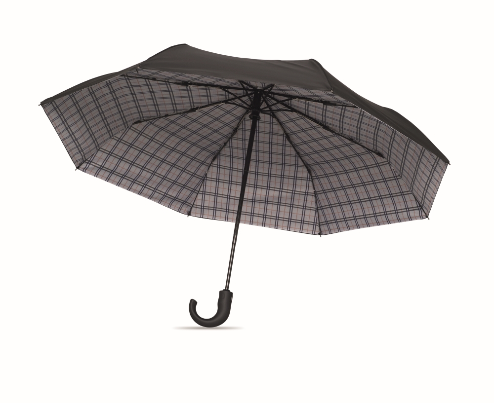23 inch 3 fold auto open/close windproof umbrella in double-layer 190T pongee with chequered inside pattern. Black plated frame and shaft. Two-section black fibreglass nickel plated middle part. Curved wooden handle. Dimensions: 116 cm