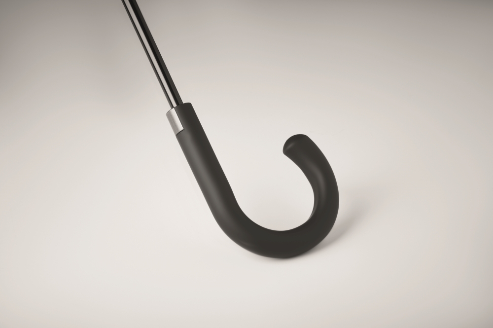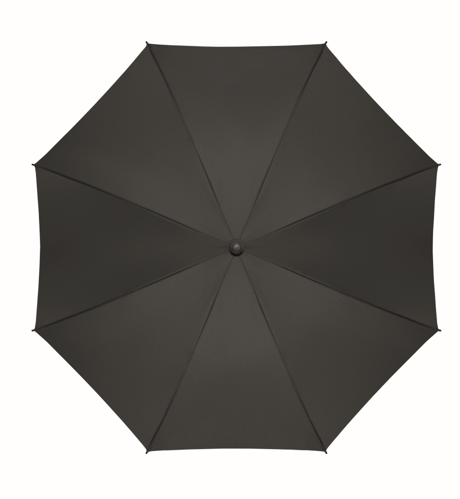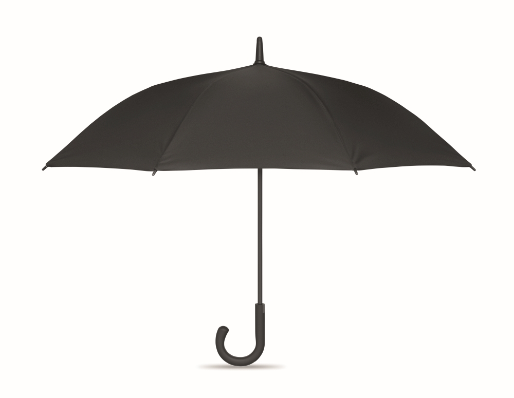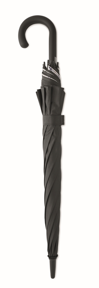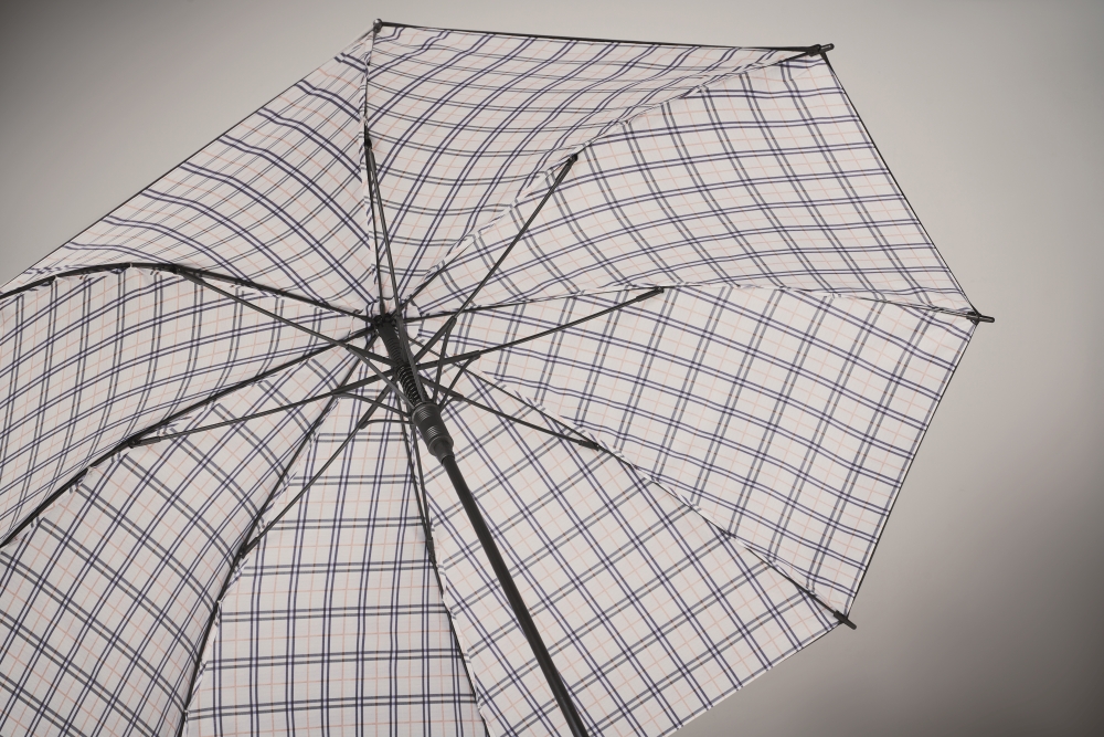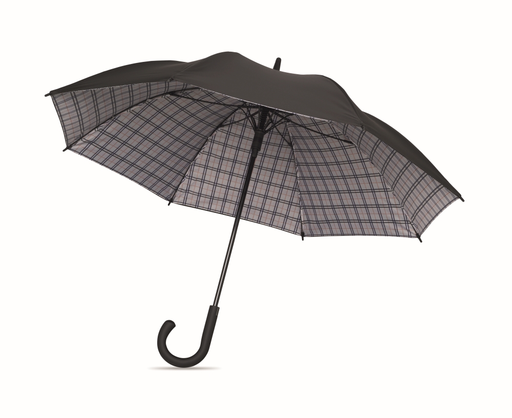 23 inch auto open windproof umbrella in 190T pongee with chequered inside pattern. Fibreglass frame with black plated shaft and plastic tips. Curved rubber finished handle. Manual closure. Dimensions: 58,5 cm
