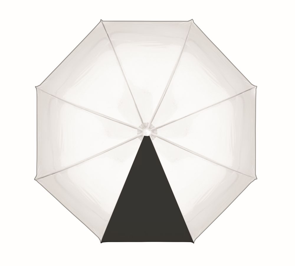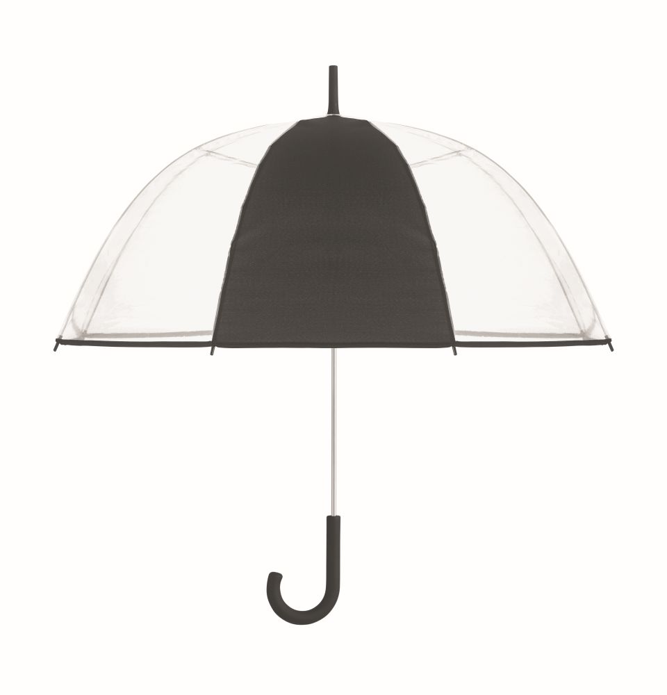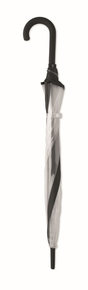 23 inch straight umbrella in POE with piping and 1 panel in polyester for printing area. Manual open. Fiberglass, ribs and frame. Chrome plated shaft with plastic tips. Rubber finished handle.