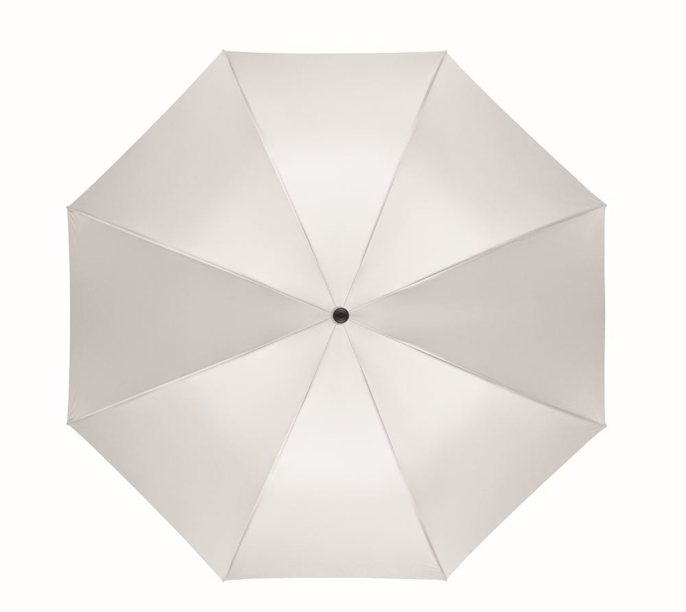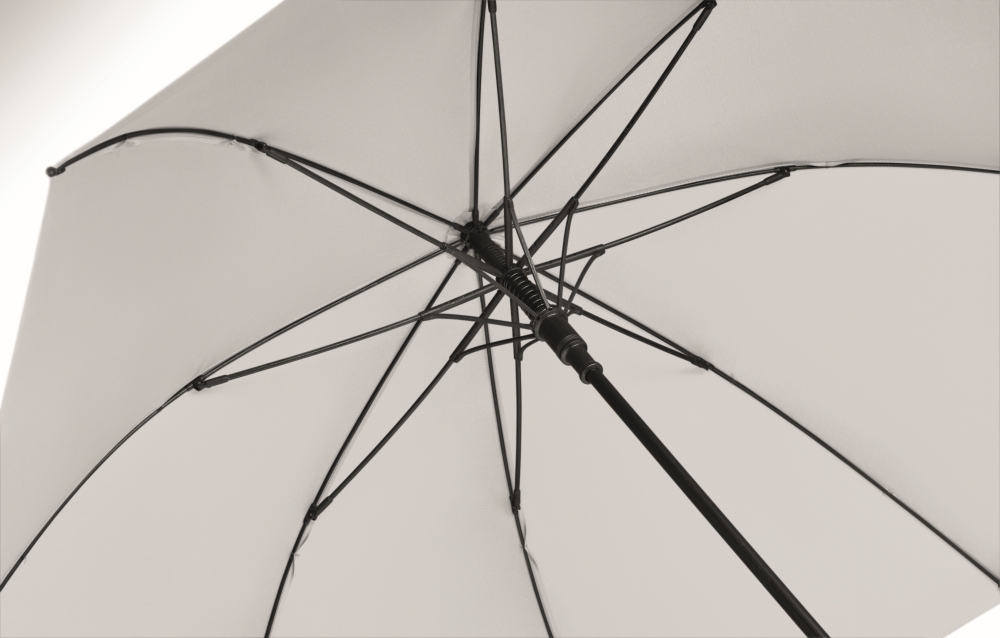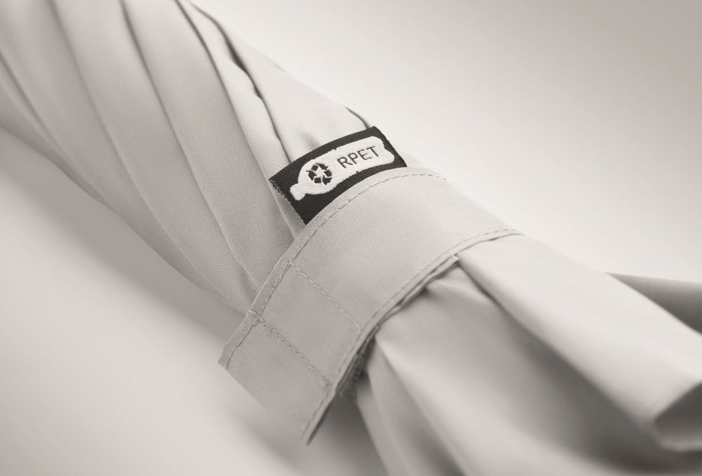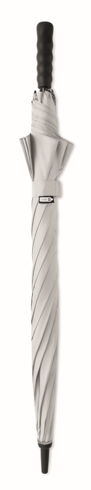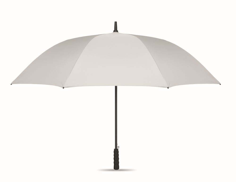 27 inch auto open wind-proof umbrella in 190T RPET pongee. Fibreglass shaft and ribs. Wheatstraw and recycled ABS handle. Plastic tips and top. Dimensions: 116 cm