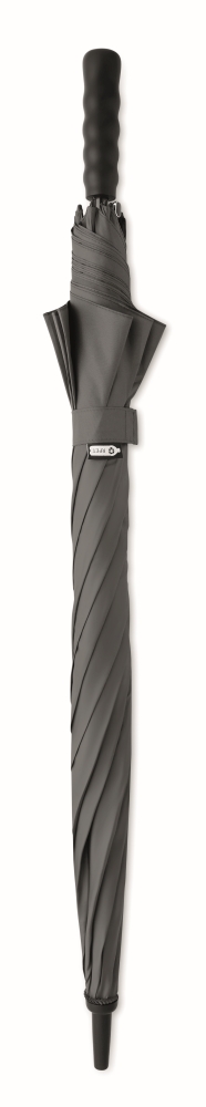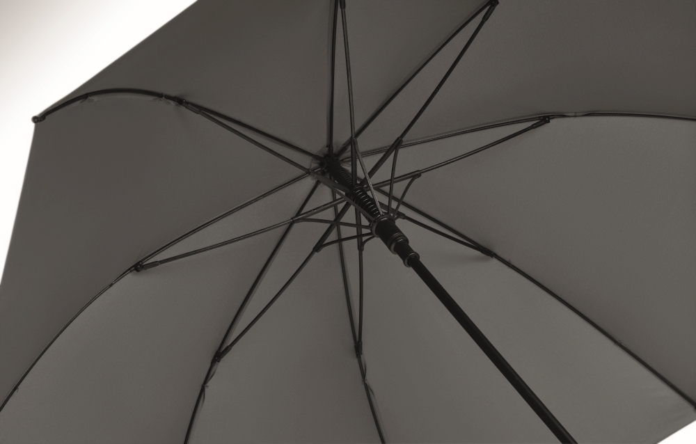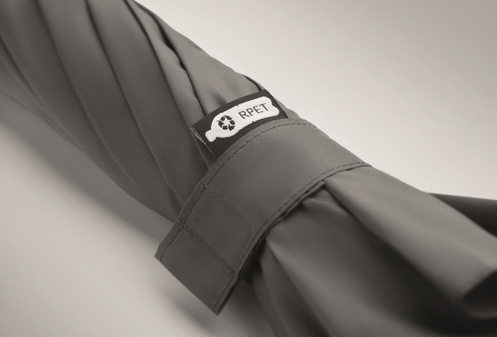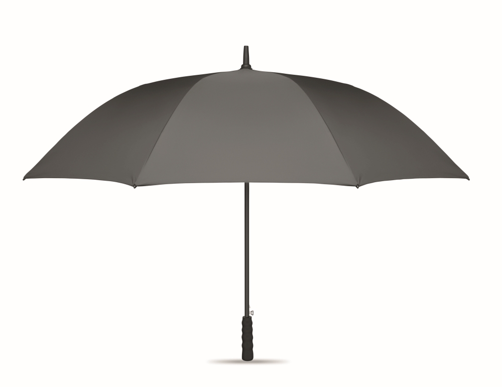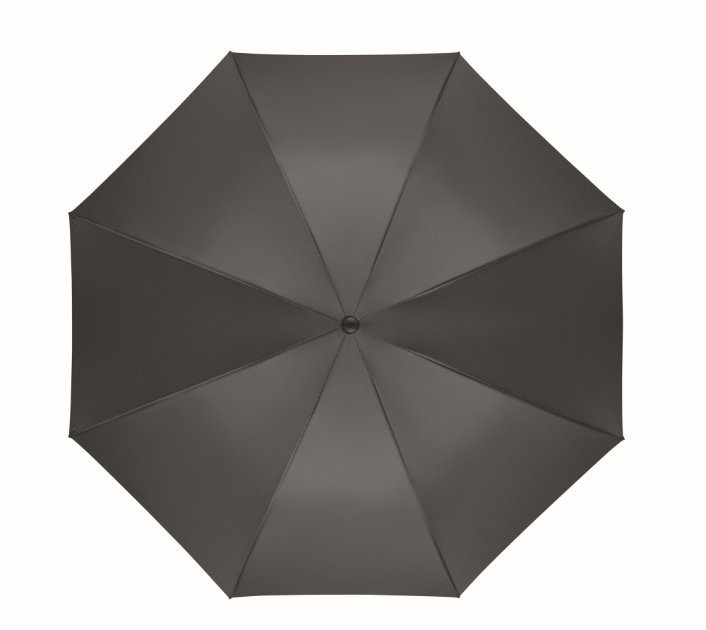 27 inch auto open wind-proof umbrella in 190T RPET pongee. Fibreglass shaft and ribs. Wheatstraw and recycled ABS handle. Plastic tips and top. Dimensions: 116 cm