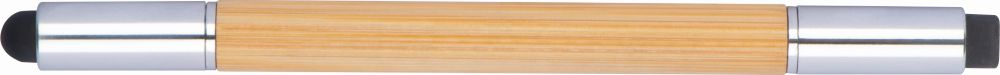 2in1 bamboo writing instrument consisting of a blue writing pen, touch function, an erasable endless refill and a matching eraser. Your logo is engraved on the writing instrument.