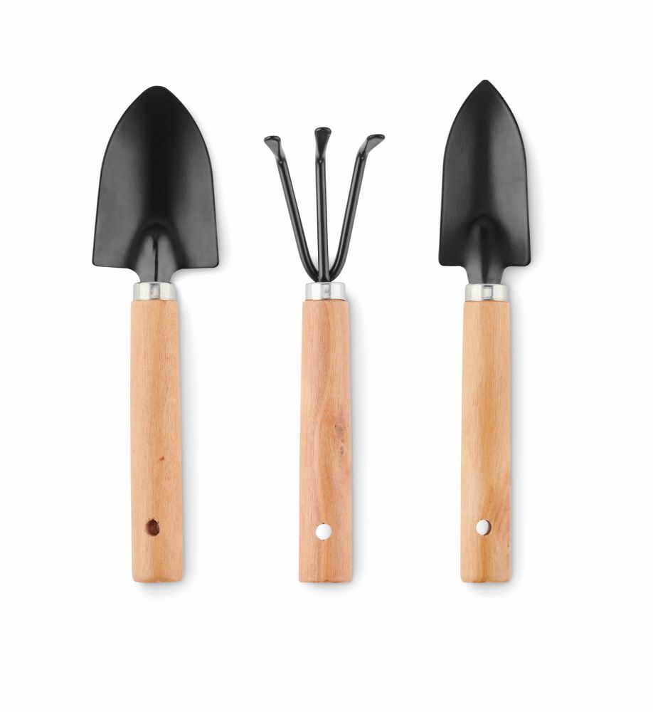 Set of 3 garden tools. Harrow and 2 spades. Presented in RPET felt pouch with hook and look closure.