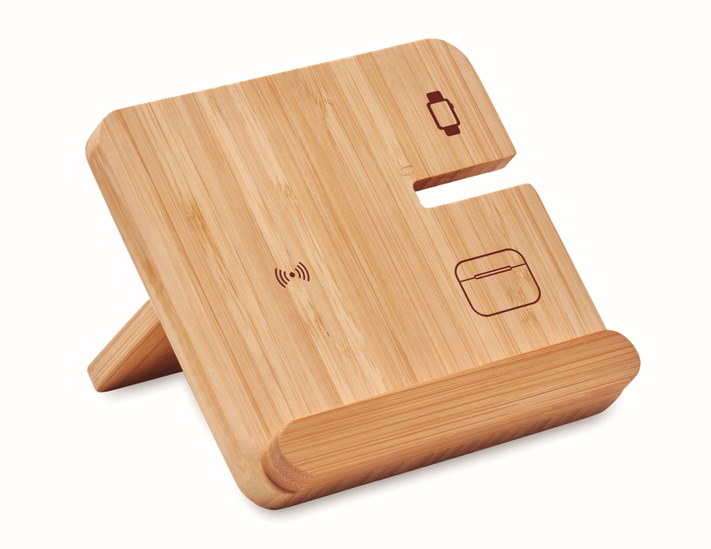 3 in 1 foldable charging station in bamboo case and phone stand. It includes a dual coil wireless charger 15W, smartwatch charger (Apple®only) and TWS charger. Dimensions: 13,9 x 13,1 x 2,7 cm