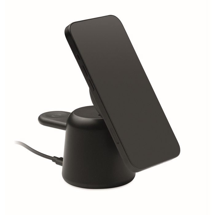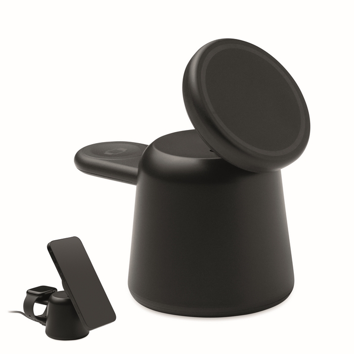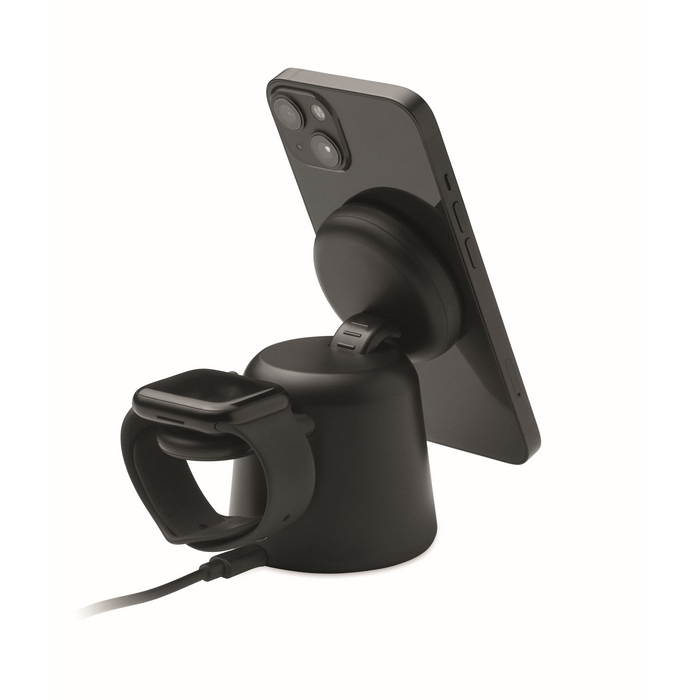 3 in 1 charging station in ABS. Includes 15W magnetic wireless charger for phone and TWS with phone holder functionality and smartwatch charger (iOS only). Magnetic feature compatible with iPhone® 12 and newer. Including additional magnetic metal ring to support charging of other non-magnetic wireless chargeable phones.Dimensions: 10,2 x 7,1 x 12cm