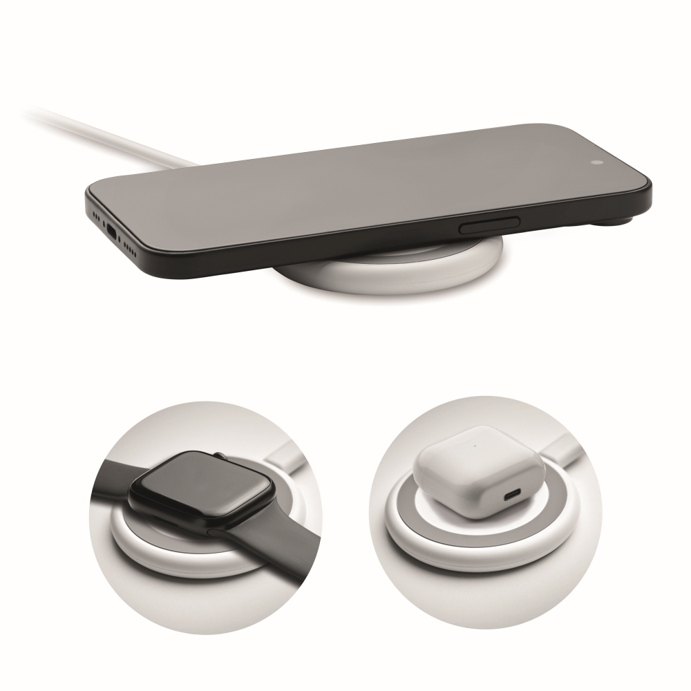 3 in 1 wireless charger 15W . It includes a magnetic wireless charger 15W, smartwatch charger (Apple®only) and TWS charger. Cable length: 1M. Input: 2-in-1 Type-C and Type-A. Dimensions: O 6,5 x 0,8 cm
