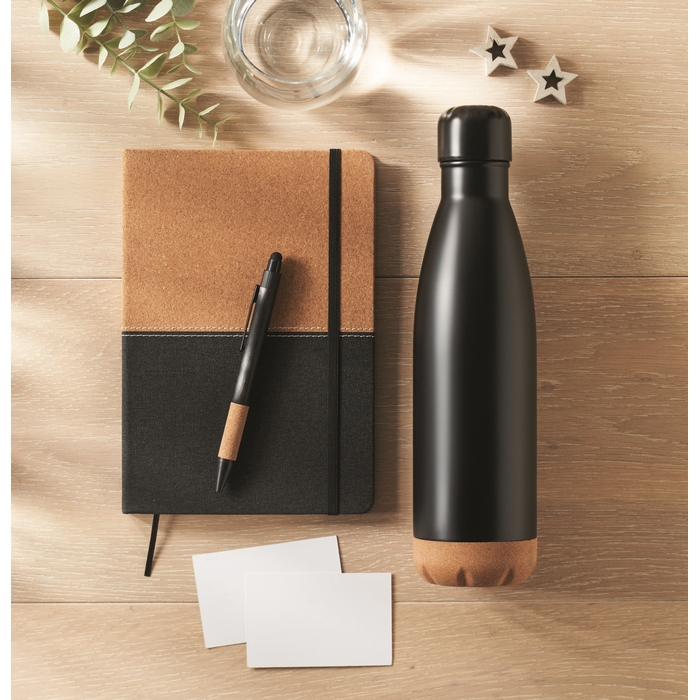 3 piece gift set including a double wall stainless steel insulated bottle 500ml, A5 notebook with hard RPET and cork casebound cover with 160 lined recycled paper pages (80 sheets) and an aluminium push ball pen. Blue ink. FSC®-certified | FSC MIX CREDIT, P7.1, N3.7, FSC-C213206Dimensions: 28 x 23,5 x 7,8cm