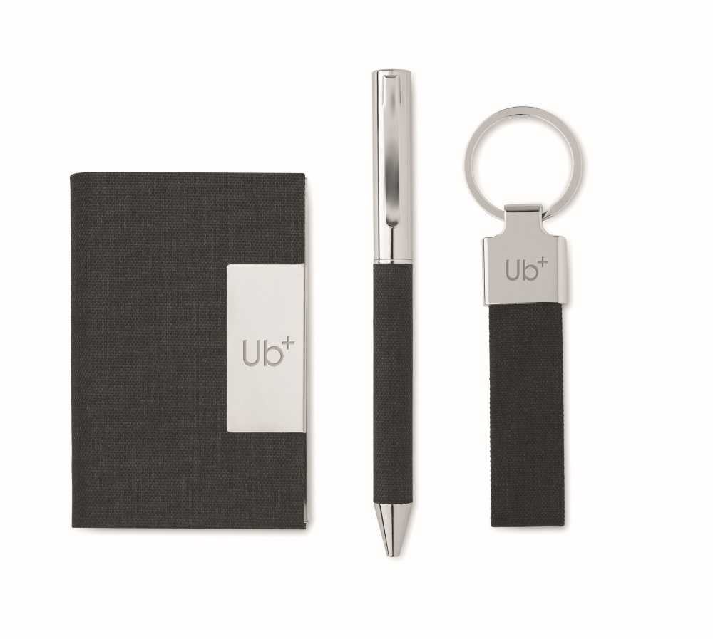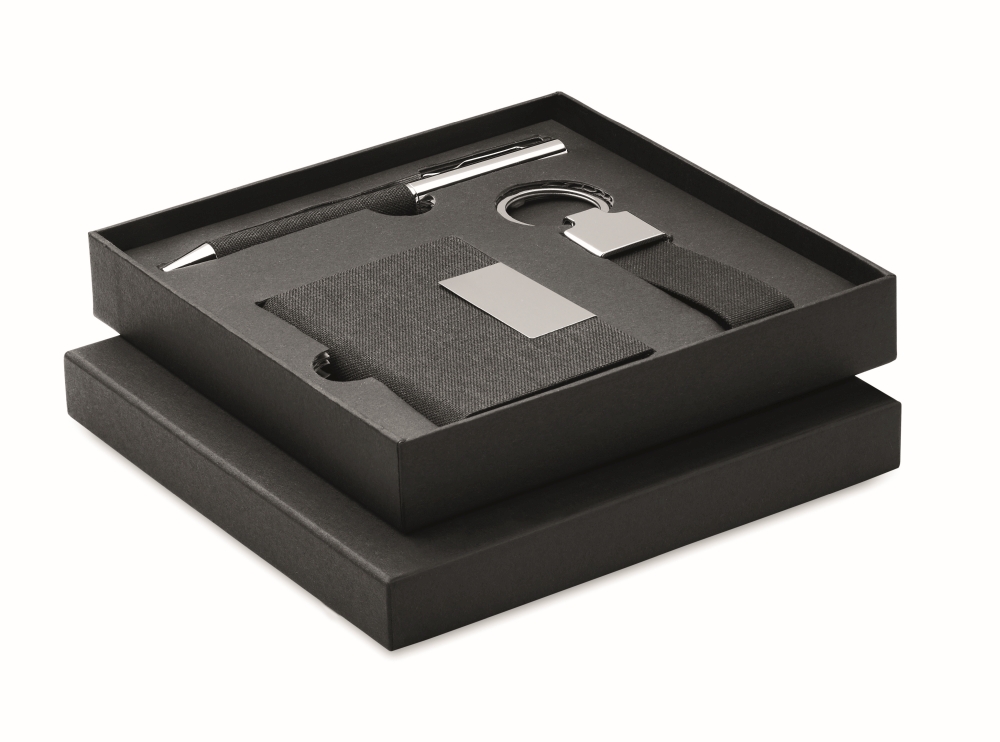 Including metal twist ball pen with RPET polyester detail, RPET polyester key ring and RPET polyester cardholder with metal plate. Blue ink. Dimensions: 16 x 16 x 2,7 cm
