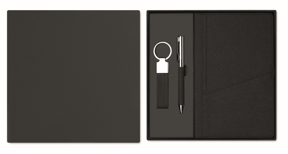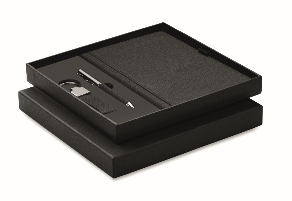 Including metal twist ball pen with RPET polyester detail, RPET hard cover notebook with front smartphone pocket, and RPET polyester keyring. Blue ink. Dimensions: 22,6 x 21,6 x 2,5 cm