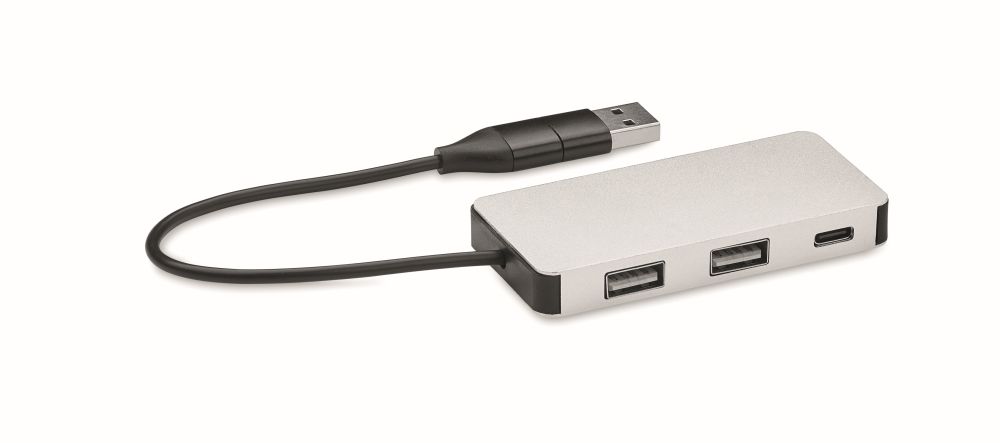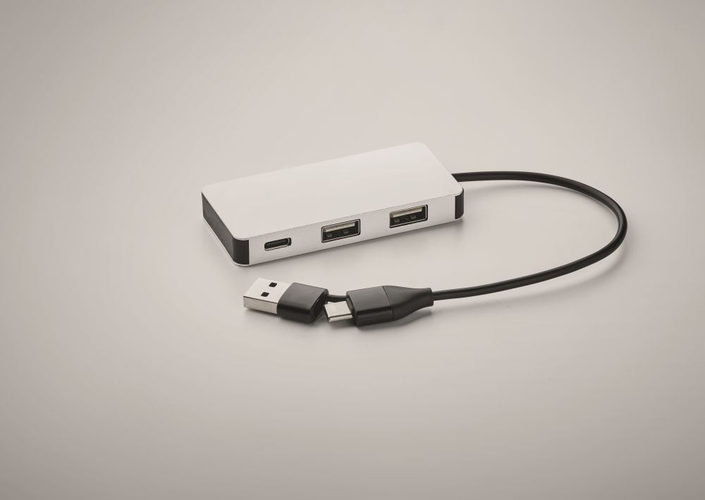 Charging cable in aluminium. Output: 2 x Type-A and 1 x Type-C. Input:2-in-1 Type-C & Type-A. Cable length: 20 cm.