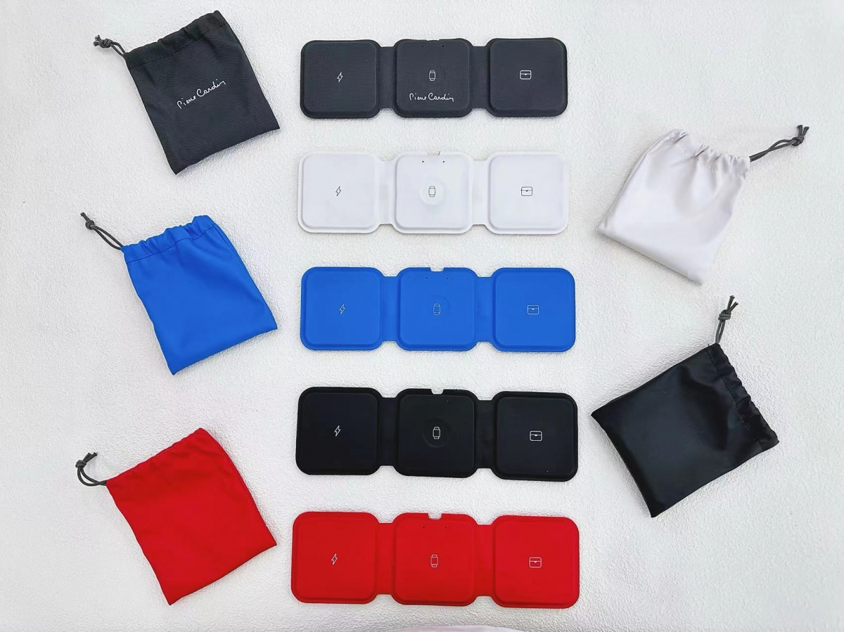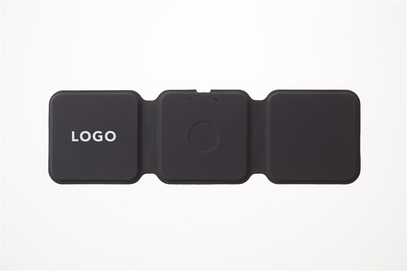 Wireless, foldable 3-in-1 charger for smartphones, earphones and Apple Watch® in gray artificial leather. On request from 100 pieces, it is also possible to have chargers in a different color, according to available shades. Packed in a brown box. 4-5 weeks Wireless power: 15W Input: 5V/2A,9V/2A,12V/1.5A Headphone: 5W / iWatch: 2.5W Size: 245 x 75 x 6.5 mm / Weight: 90 g Print area: 40 x 20 mm