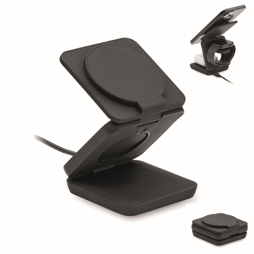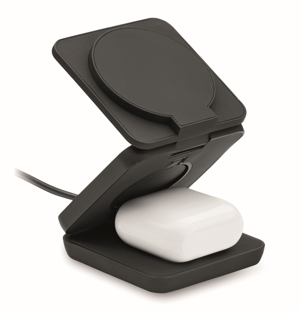3 in 1 foldable charging station in rubberized recycled ABS. It includes a magnetic wireless charger 15W, smartwatch charger (Apple®only) and TWS charger. Dimensions: 7 x 7 x 2,6 cm