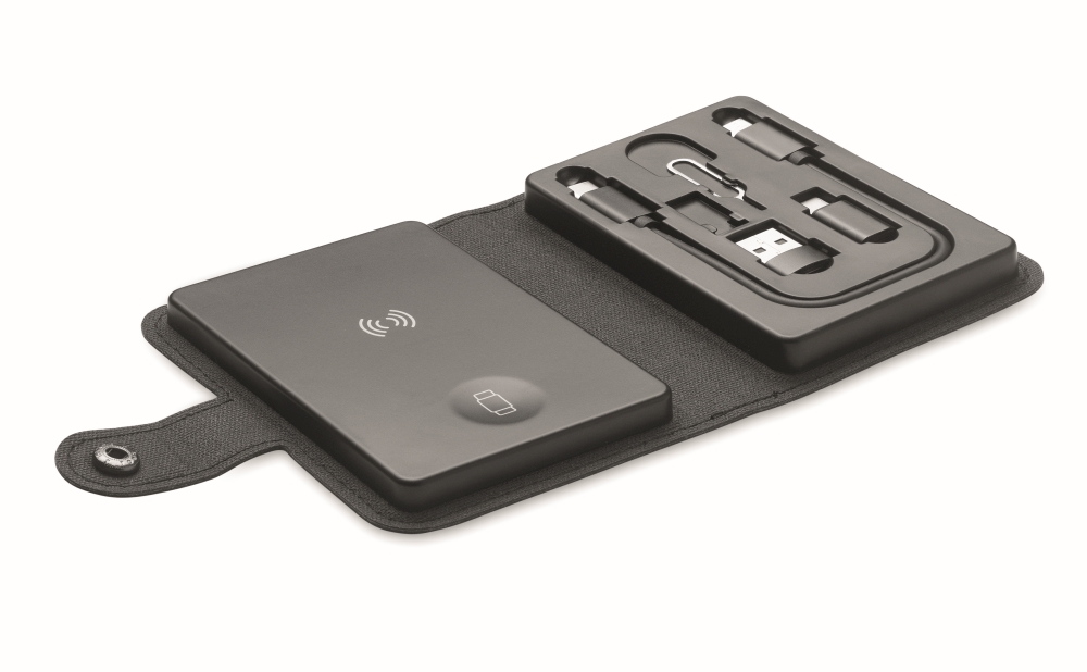 Cable connector set with wireless charger 15W and watch charger (Apple®only). 4 in 1 charging cable with ejector pin tool. Recycled PU cover, plastics in recycled ABS and recycled aluminium plate. Dimensions: 11 x 8,3 x 2,7 cm