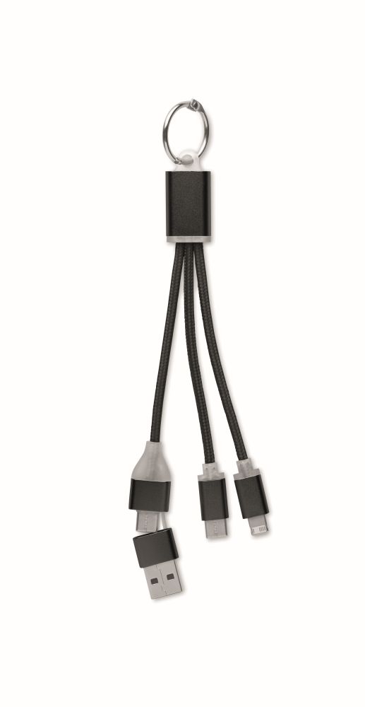 Key ring with charging cable with input: 2-in-1 type-C & type-A and micro-B (2 in 1 pin) and Type C output.