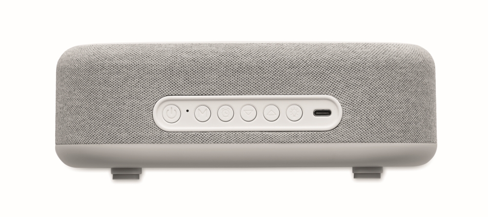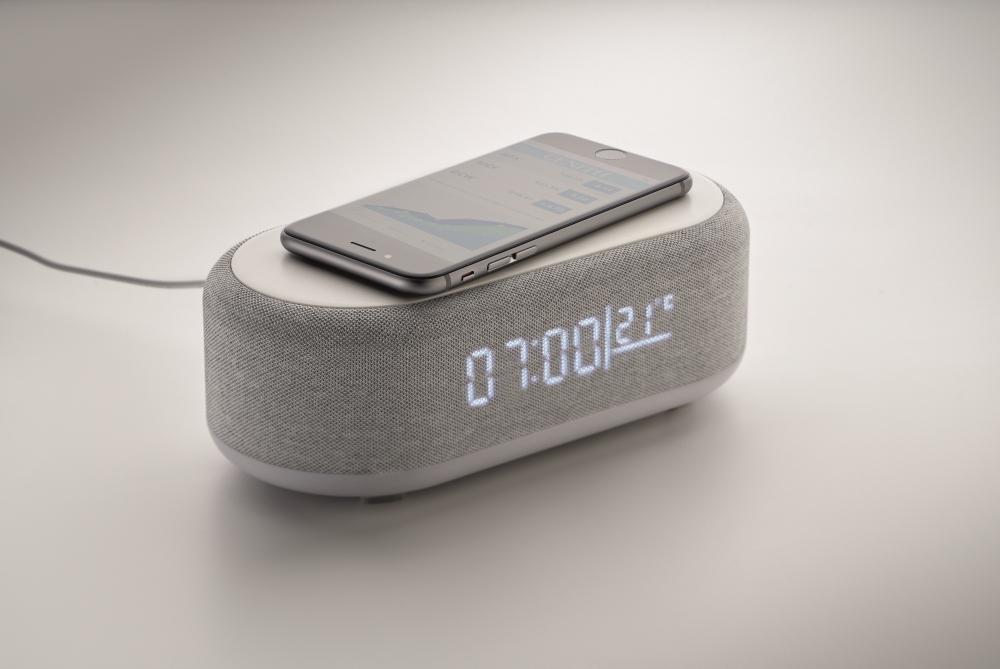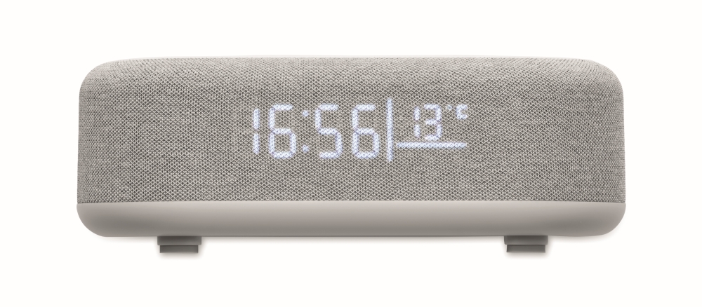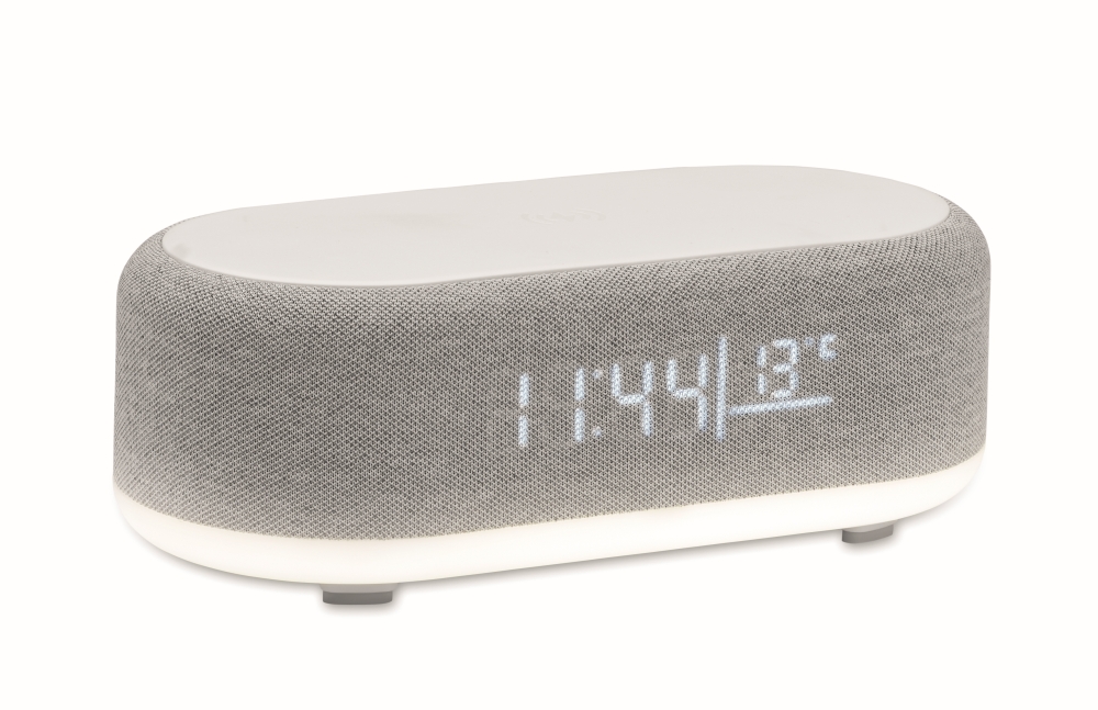 4-in-1 wireless 15W charging 5W speaker in ABS with weather station and ambient light. Alarm clock. Time and temperature display. Built-in Li-Iin battery: 1200 mAh. Playing time approx. 7 hours. Dimensions: 20 x 9,8 x 6,4 cm