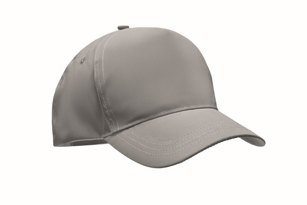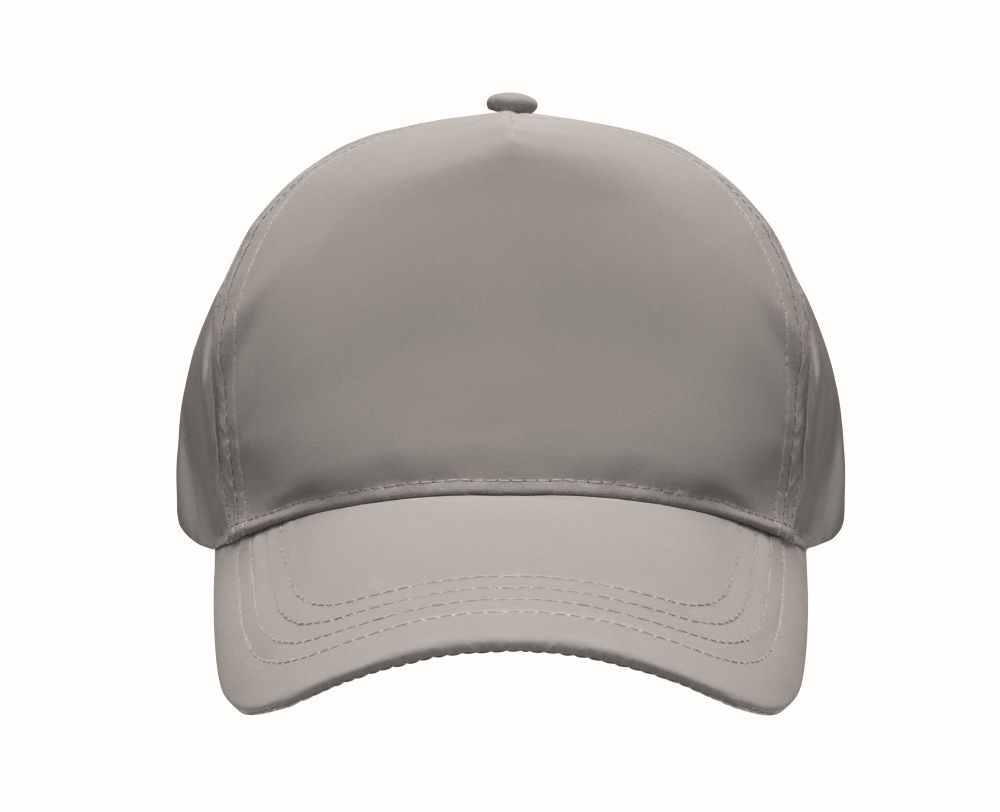 5 panel baseball cap in high reflective 190T polyester. 4 stitched eyelets with hook and loop closure. Size 7 1/4.