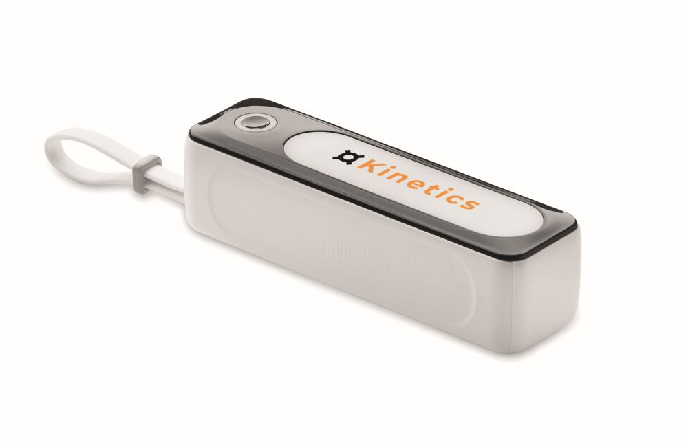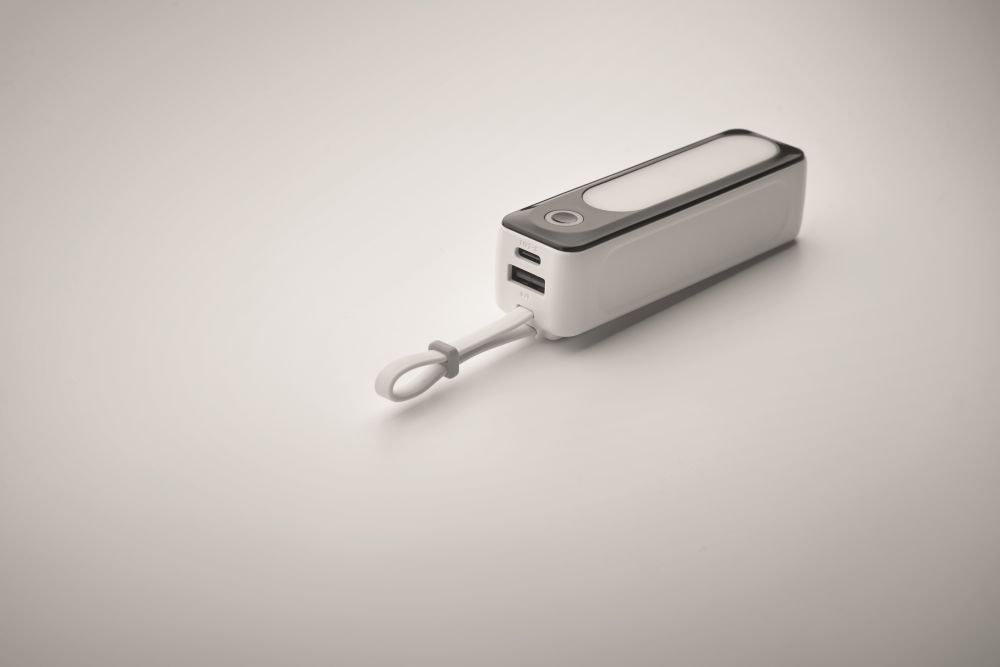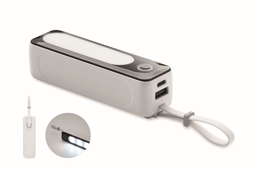 Power bank 5000 mAh capacity in abs casing. Output current DC5V/2A 1x type A and 1x type C in/out. Includes indicating 4 light setting (6 COB led) and integrated USB cable with Type C plug output.