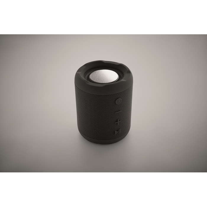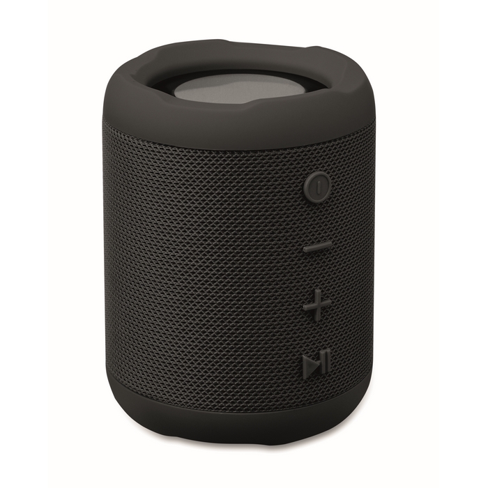 5.0 wireless speaker in ABS with RPET fabric. 1 Rechargeable Li-ION 800 mAh battery included. Includes an SD card port and an AUX/ USB cable. Output data: 5W, 3 Ohm and 5V. Playing time approx. 3h.Dimensions: 11 x 8,5 x 8,5cm
