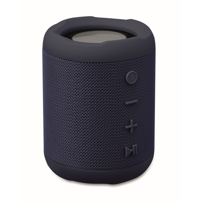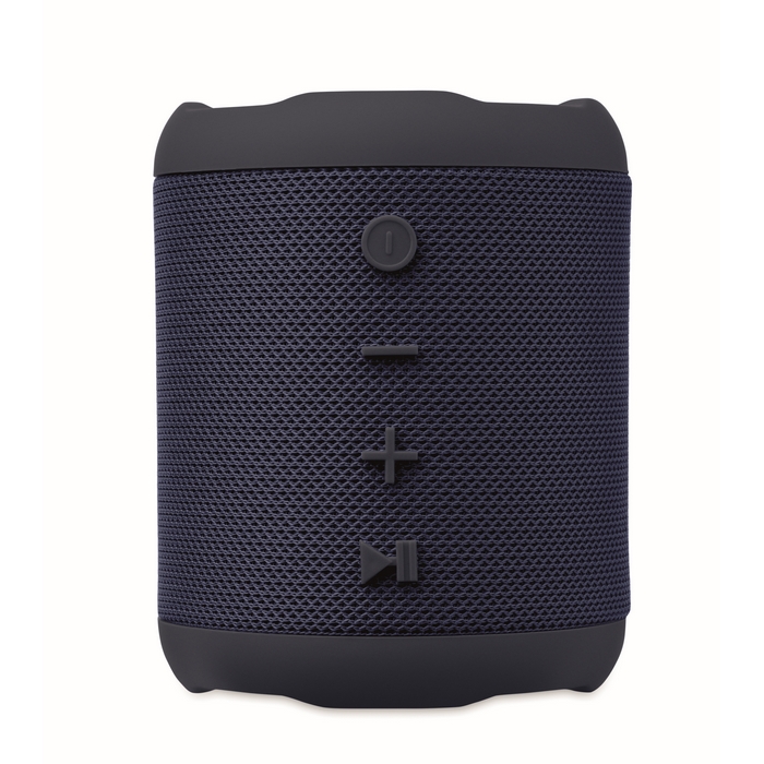 5.0 wireless speaker in ABS with RPET fabric. 1 Rechargeable Li-ION 800 mAh battery included. Includes an SD card port and an AUX/ USB cable. Output data: 5W, 3 Ohm and 5V. Playing time approx. 3h.Dimensions: 11 x 8,5 x 8,5cm