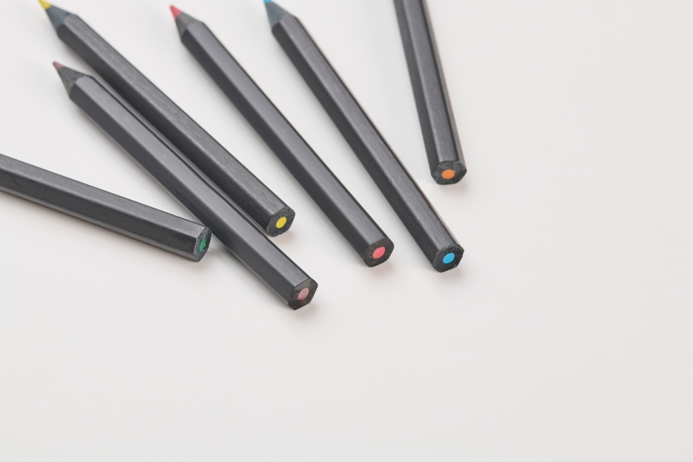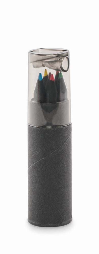 Black coloured paper tube box contains 6 colouring pencils and a pencil sharpener in the lid of the box. Dimensions: 2,7 O x 10,4 cm