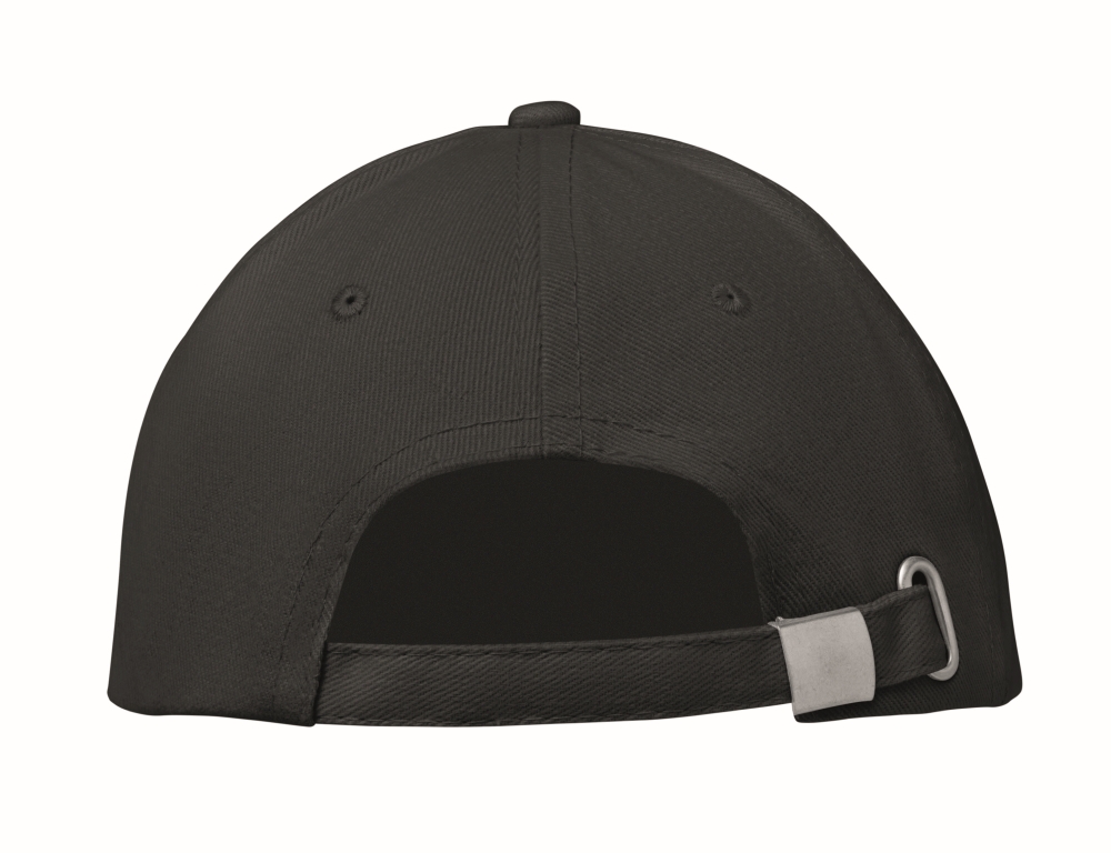 6 panel baseball cap in brushed cotton 260 gr/m2 with stainless steel buckle. Size 7 1/4. Dimensions: 21 x 17 x 11 cm