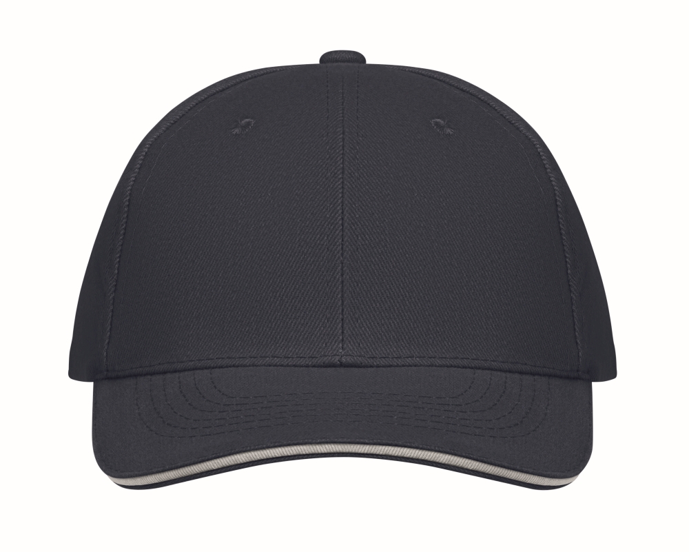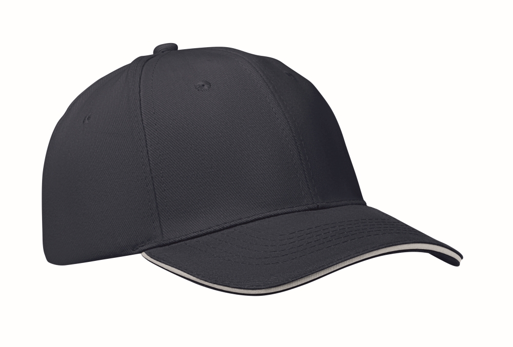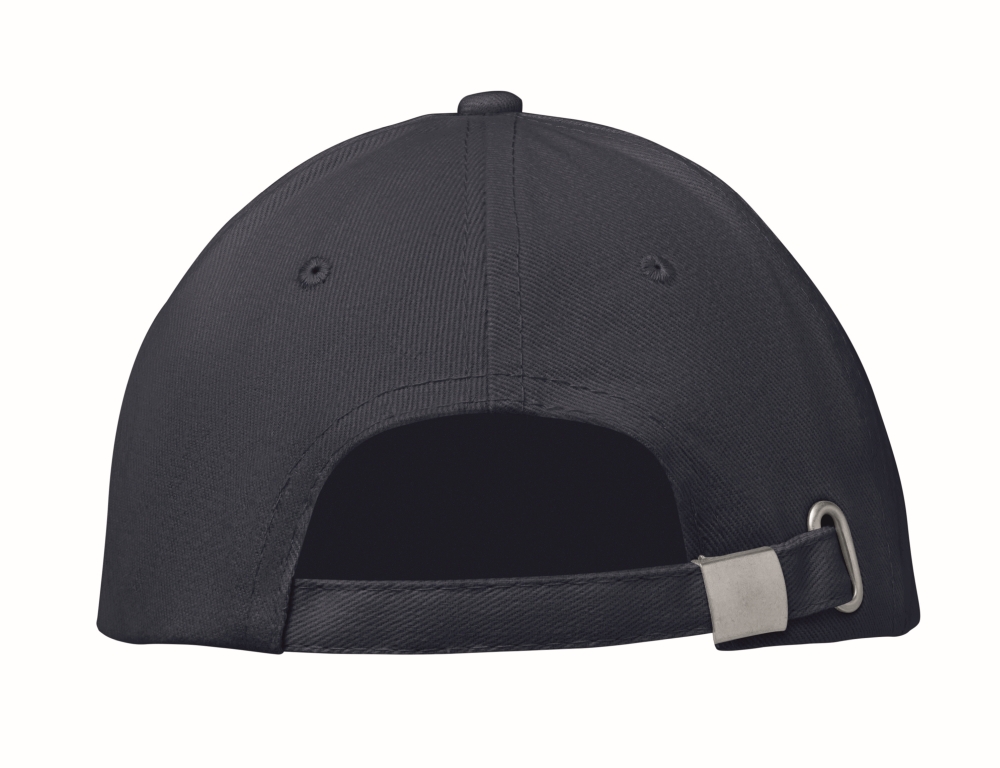 6 panel baseball cap in brushed cotton 260 gr/m2 with stainless steel buckle. Size 7 1/4. Dimensions: 21 x 17 x 11 cm