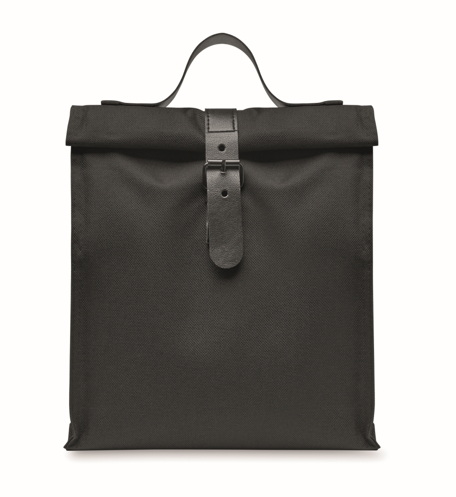 600D RPET polyester insulated roll top lunch cooler bag with PU handle and closure. Insulation: 3mm PE foam with PEVA. Dimensions: 24 x 12 x 25 cm