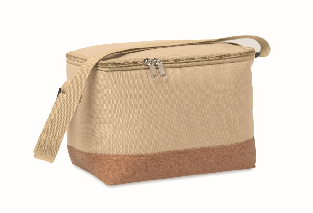 RPET 600D cooler bag with cork base detail. PEVA with 2mm PE foam. Capacity 5L. Dimensions: 22 x 14,5 x 17 cm