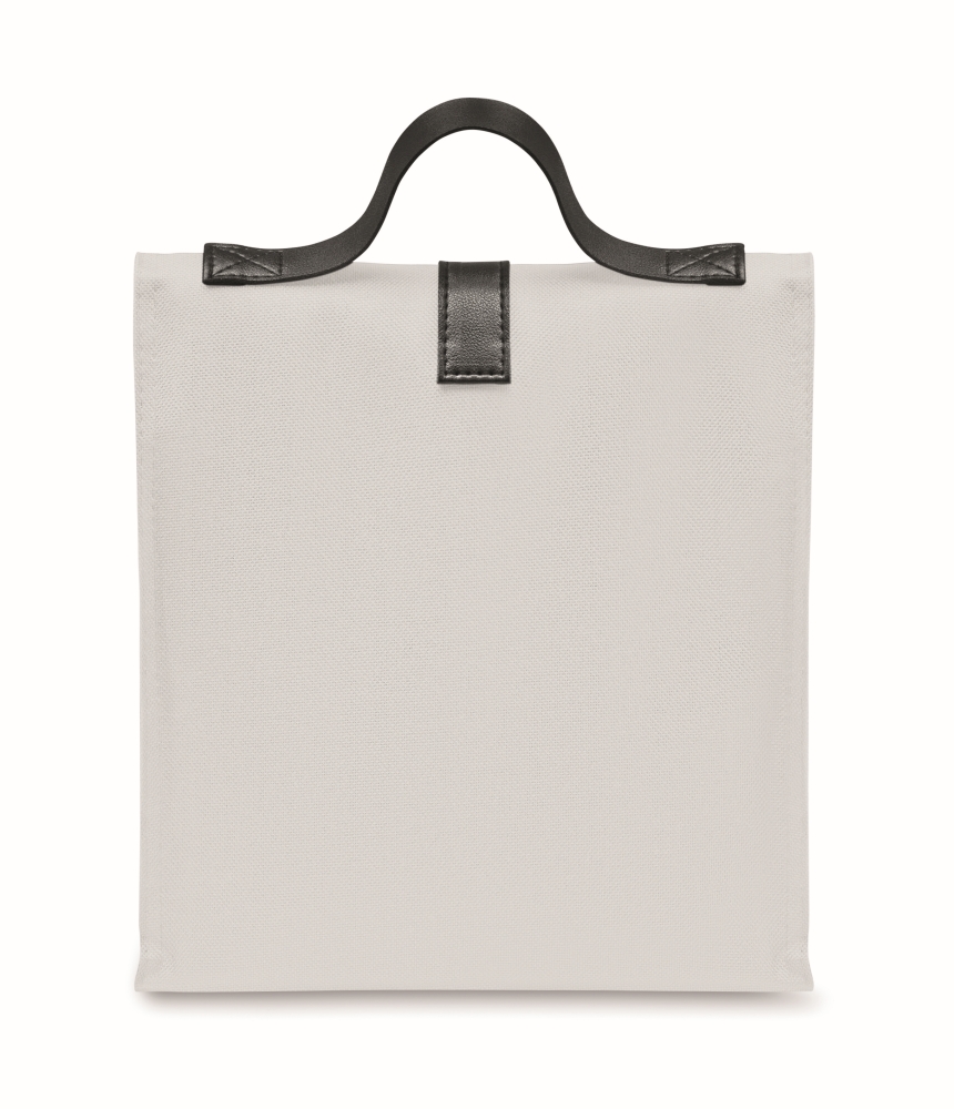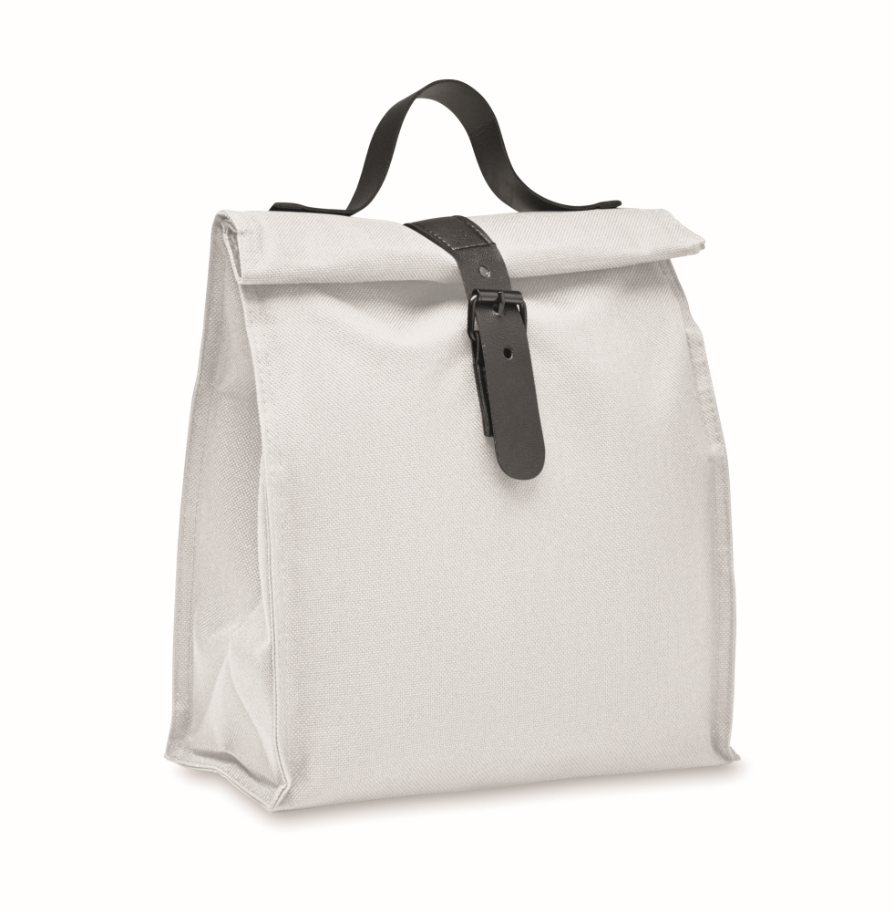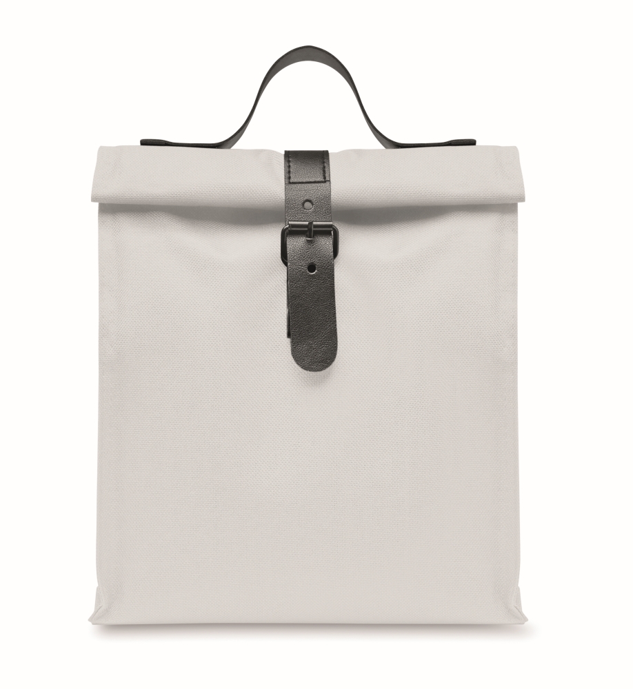 600D RPET polyester insulated roll top lunch cooler bag with PU handle and closure. Insulation: 3mm PE foam with PEVA. Dimensions: 24 x 12 x 25 cm