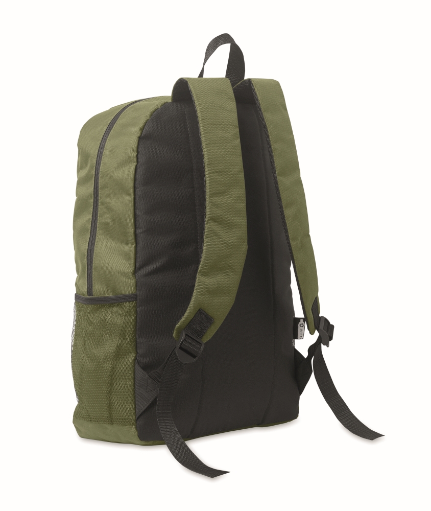 Backpack in 600D RPET polyester with decorating cord and front zippered pocket panel. Mesh pockets on both sides. Dimensions: 30 x 14 x 45 cm