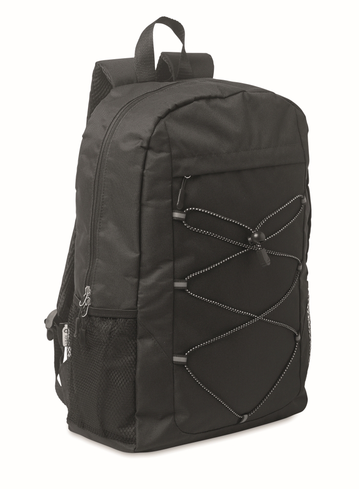 Backpack in 600D RPET polyester with decorating cord and front zippered pocket panel. Mesh pockets on both sides. Dimensions: 30 x 14 x 45 cm