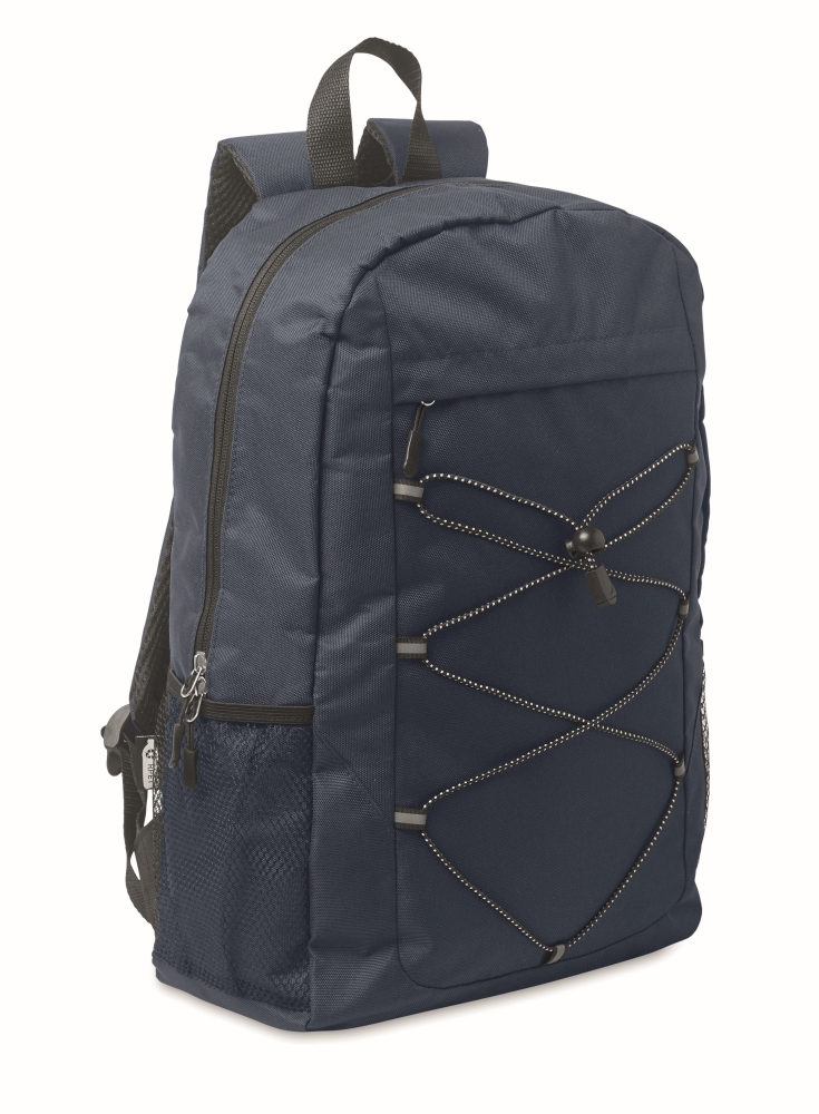 Backpack in 600D RPET polyester with decorating cord and front zippered pocket panel. Mesh pockets on both sides. Dimensions: 30 x 14 x 45 cm