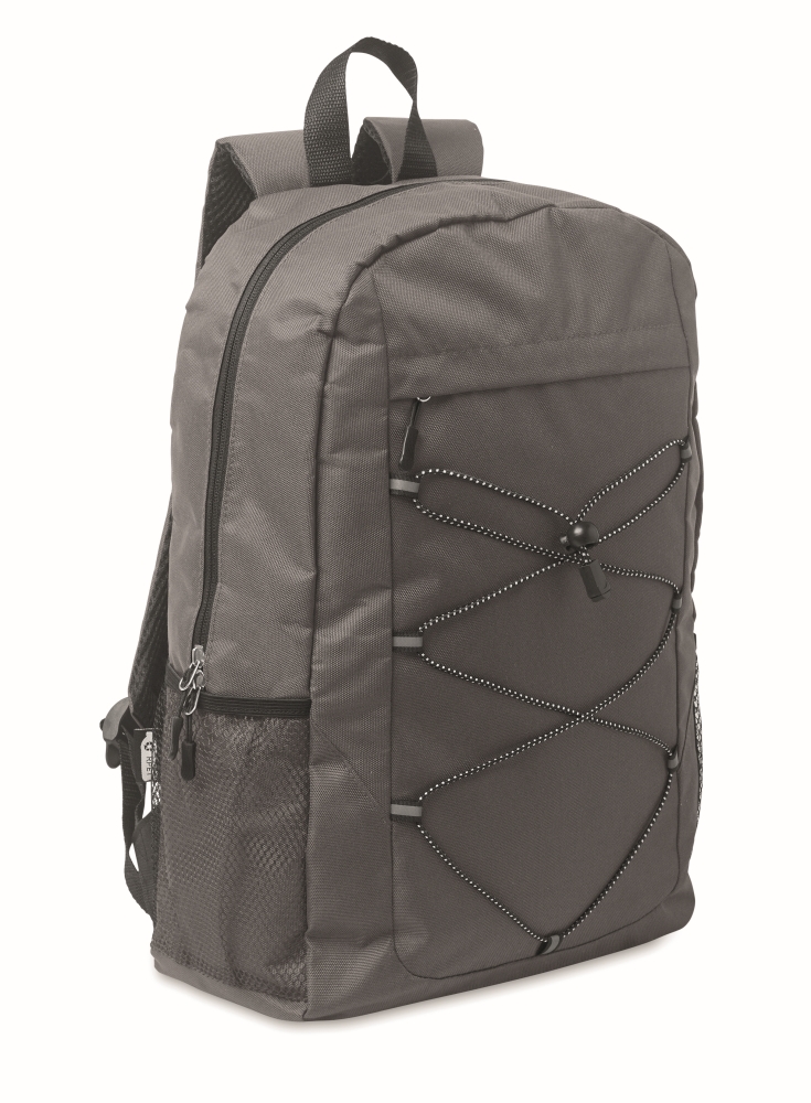Backpack in 600D RPET polyester with decorating cord and front zippered pocket panel. Mesh pockets on both sides. Dimensions: 30 x 14 x 45 cm