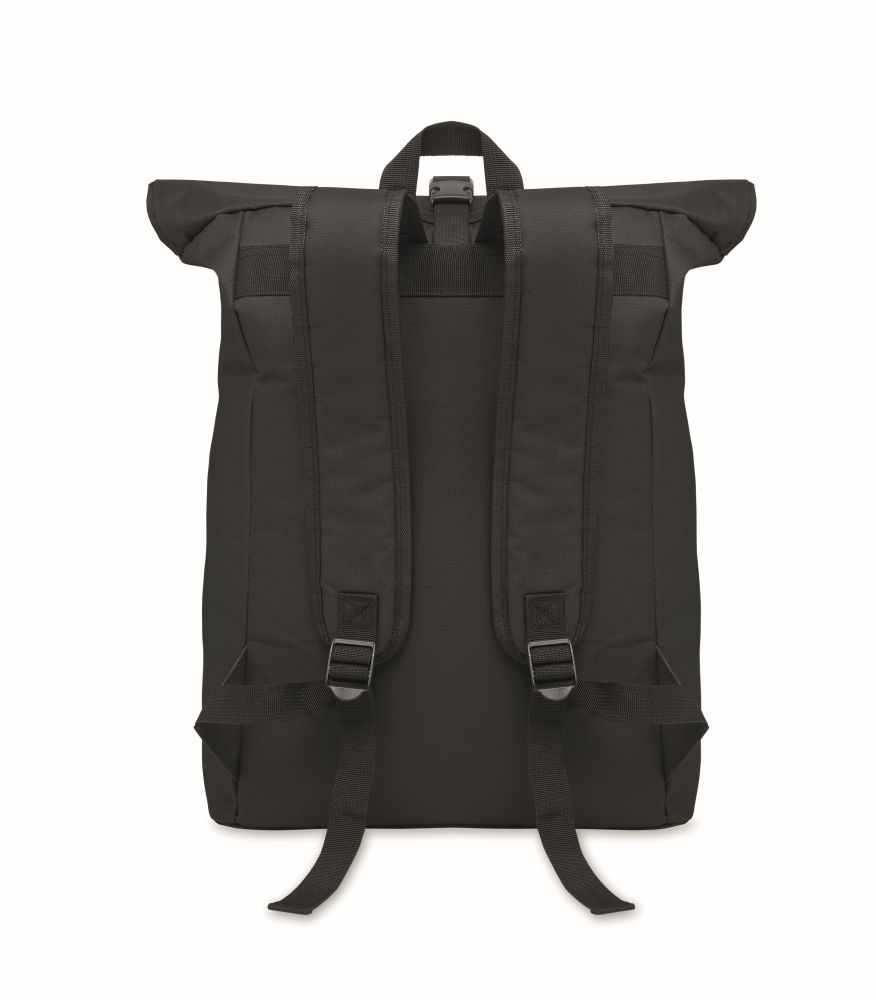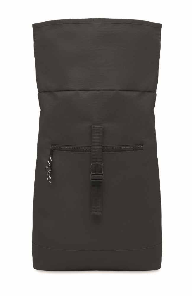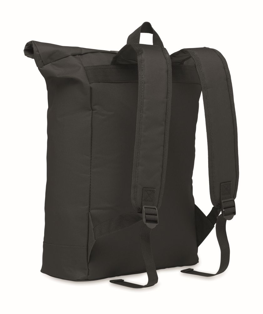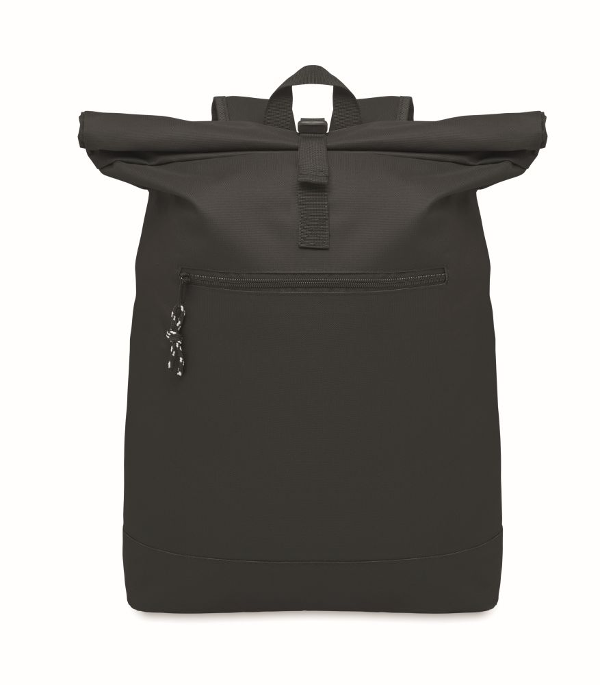 15 inch rolltop laptop backpack in 600D polyester with padded back and base reinforcement. Zippered front pocket. 210D lining.