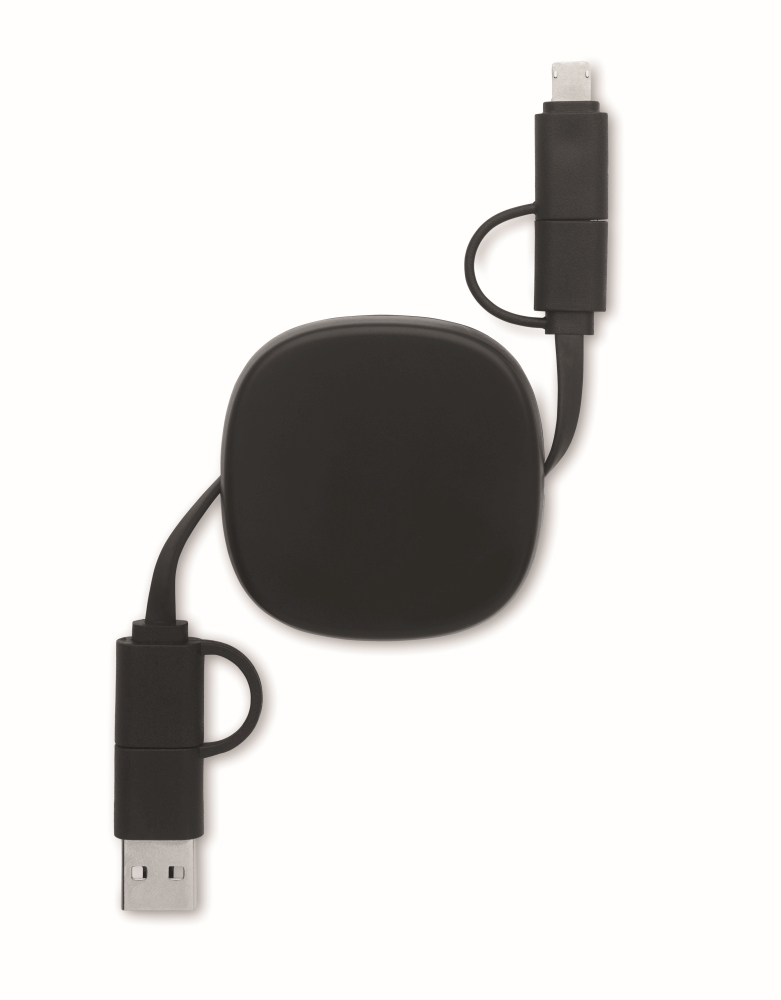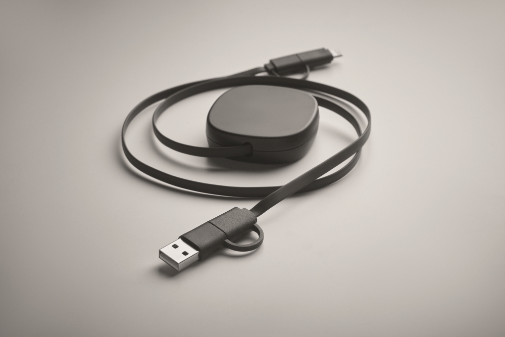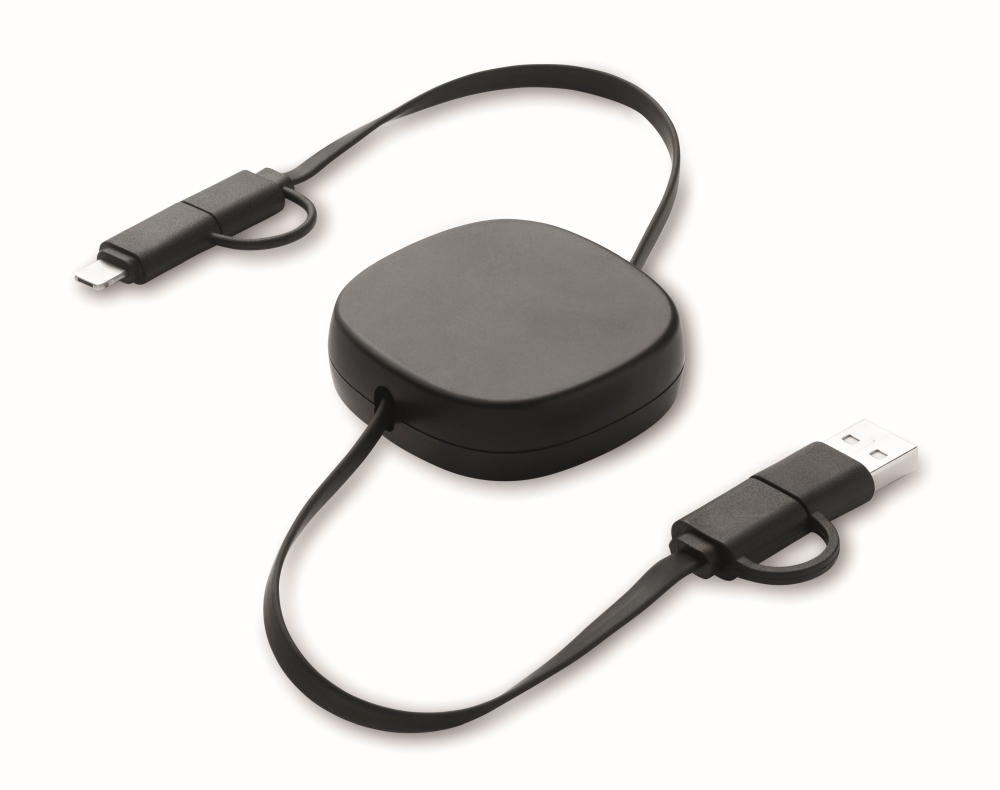 60W retractable cable in recycled ABS casing. Input: 2-in-1 Type-C and Type-A. Output: Type-C and micro-B (2 in 1 pin). Cable length: 80 cm. Dimensions: 5,3 x 5,3 x 1,6 cm