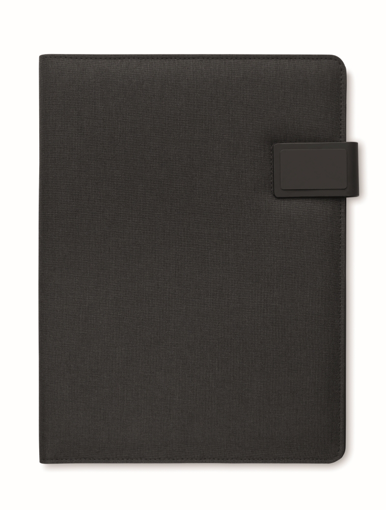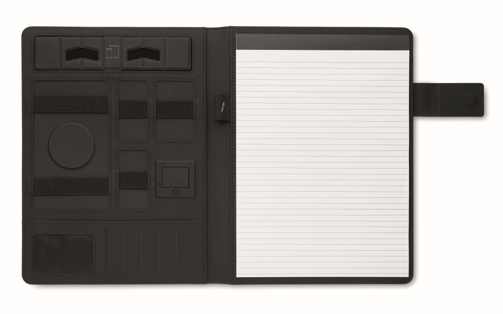 A4 conference folder with linen-PU cover. 5000 mAh power bank and 15W magnetic wireless charger. 20 lined sheets notepad. Multiple internal compartments. Magnetic closure. Elastic pen holder. Dimensions: 23 x 31 x 2 cm