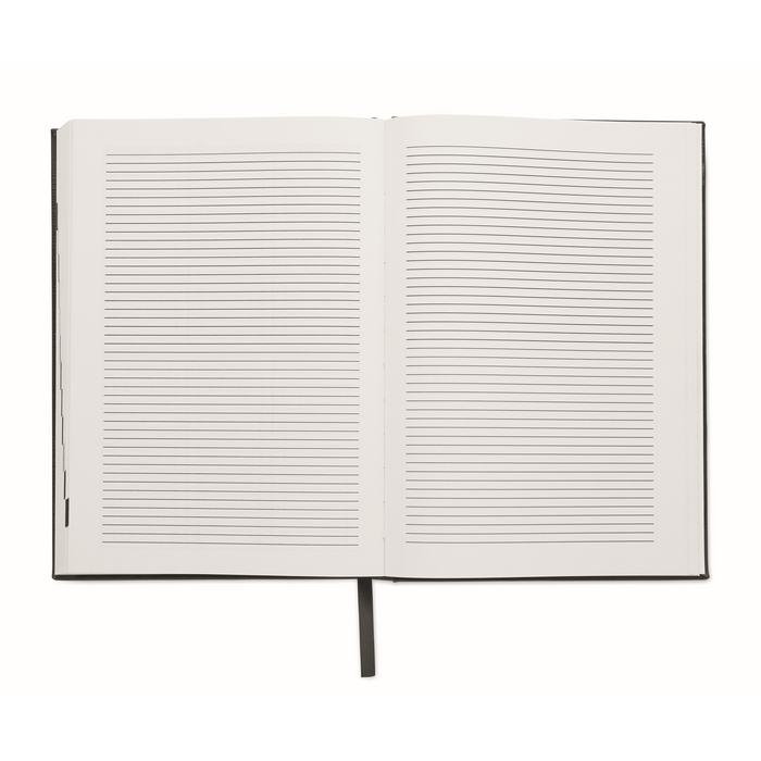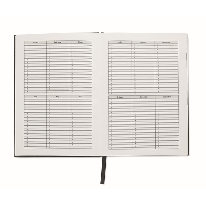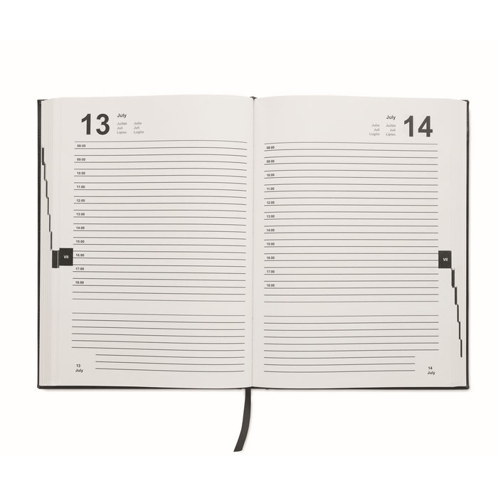 A5 daily diary notebook in 60% recycled post consumer polyester and 40% PU cover. 416 universal pages in 70gsm recycled paper (208 sheets). With matching colour polyester ribbon page marker.Dimensions: 15,4 x 21,4 x 2,5cm