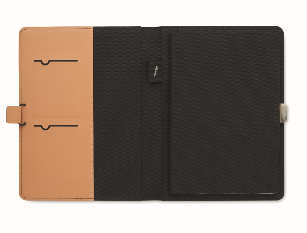 A5 portfolio in RPET with faux leather details. Replaceable A5 notebook with hard cork cover. Case bound. 128 recycled paper lined pages (64 sheets). Pen holder. 2 cardholders and one big compartment. Elastic closure strap with metal detail. Dimensions: 17,5 x 2 x 23 cm