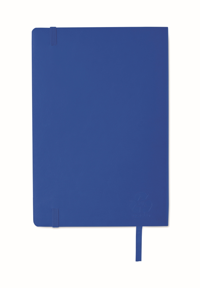 A5 notebook with soft recycled PU (81% recycled polyester and 19% PU) cover. Casebound. 160 lined pages (80 sheets recycle papers). Matching elastic closure strap and ribbon bookmark. Expandable inner pocket in the back. Dimensions: 20,8 x 1 x 14 cm